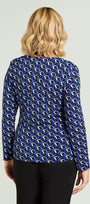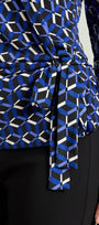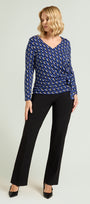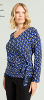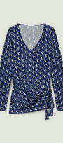 Blusa fantasia in jersey elasticizzato dalla linea sciancrata. Scollo a "V", sul fianco motivo annodato regolabile che crea drappeggio.