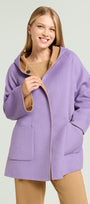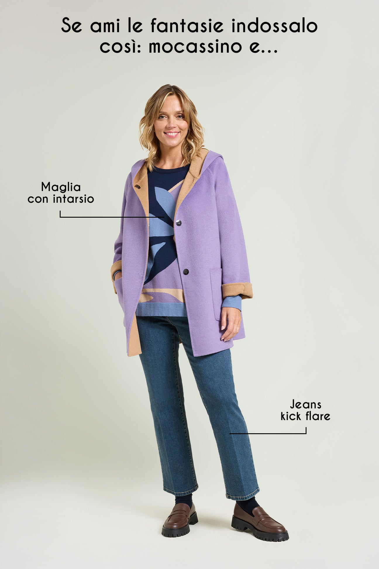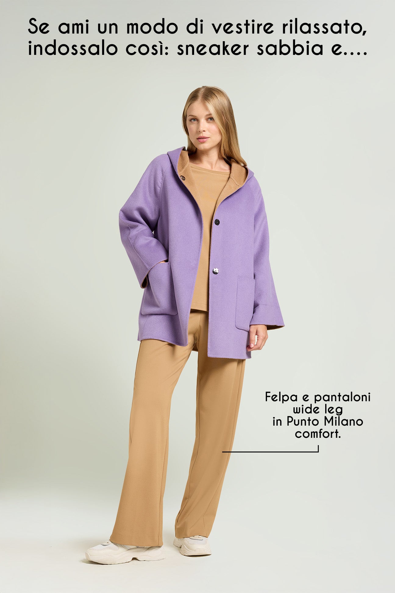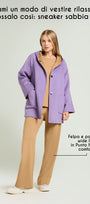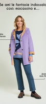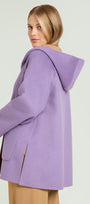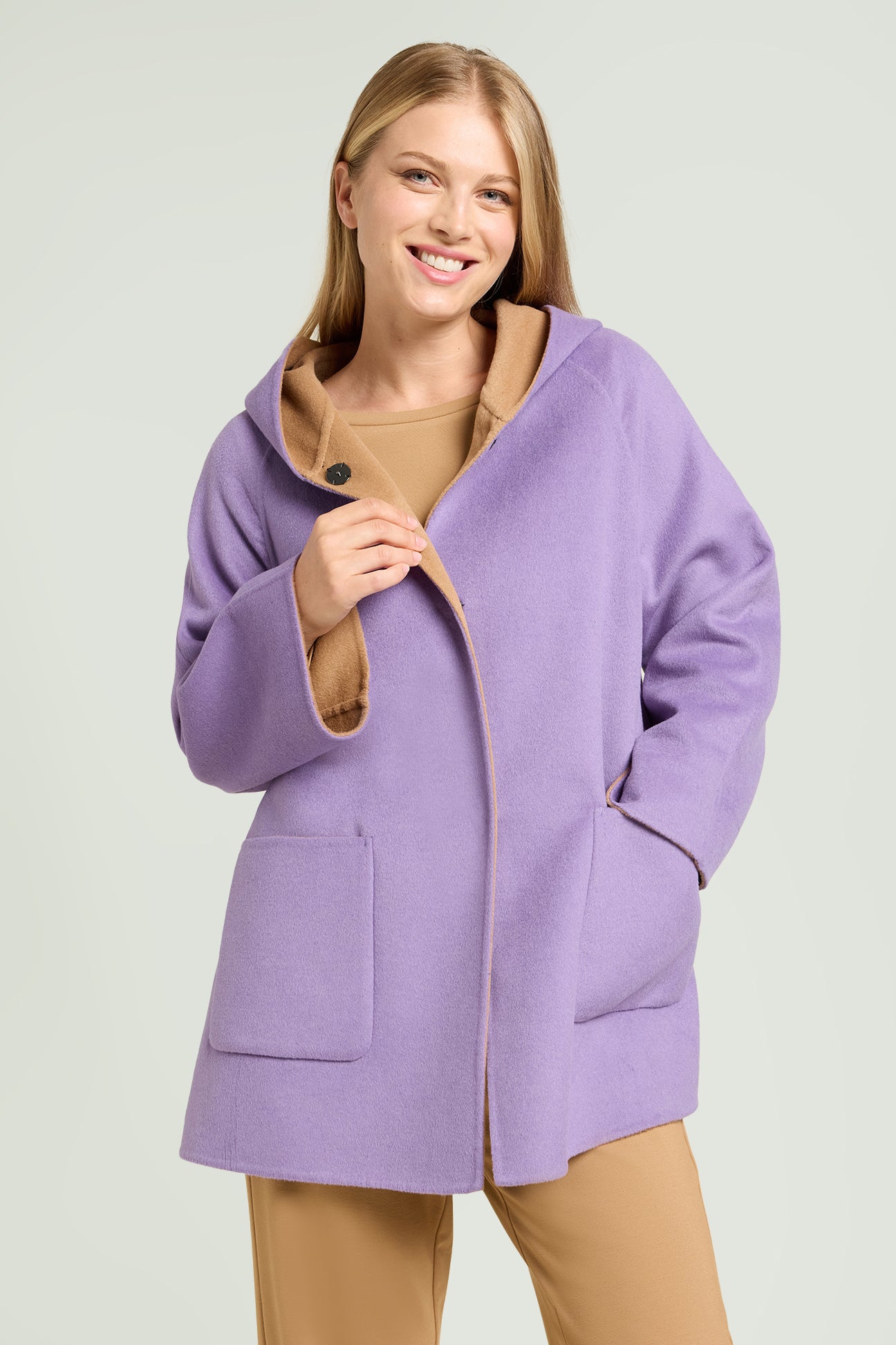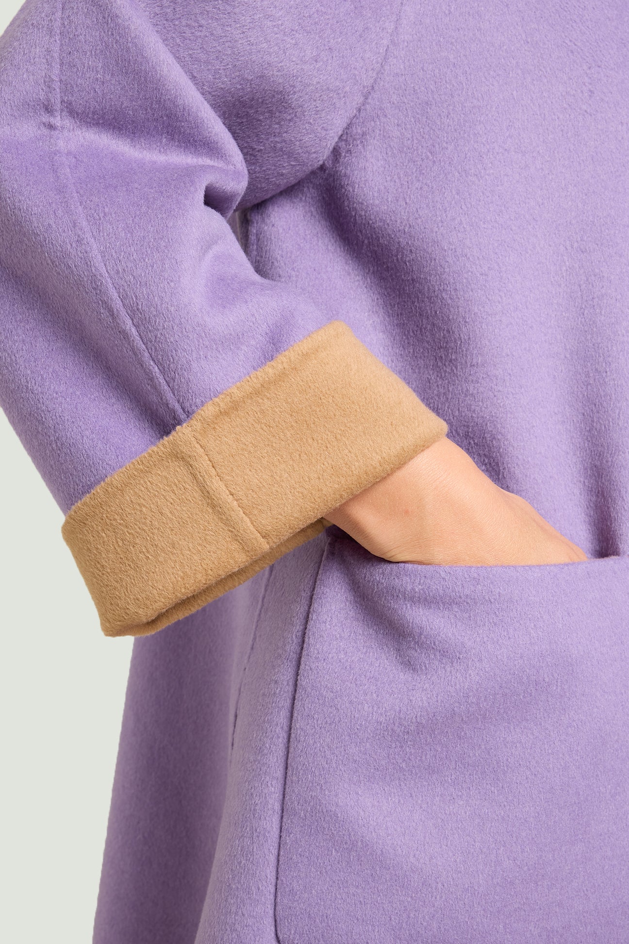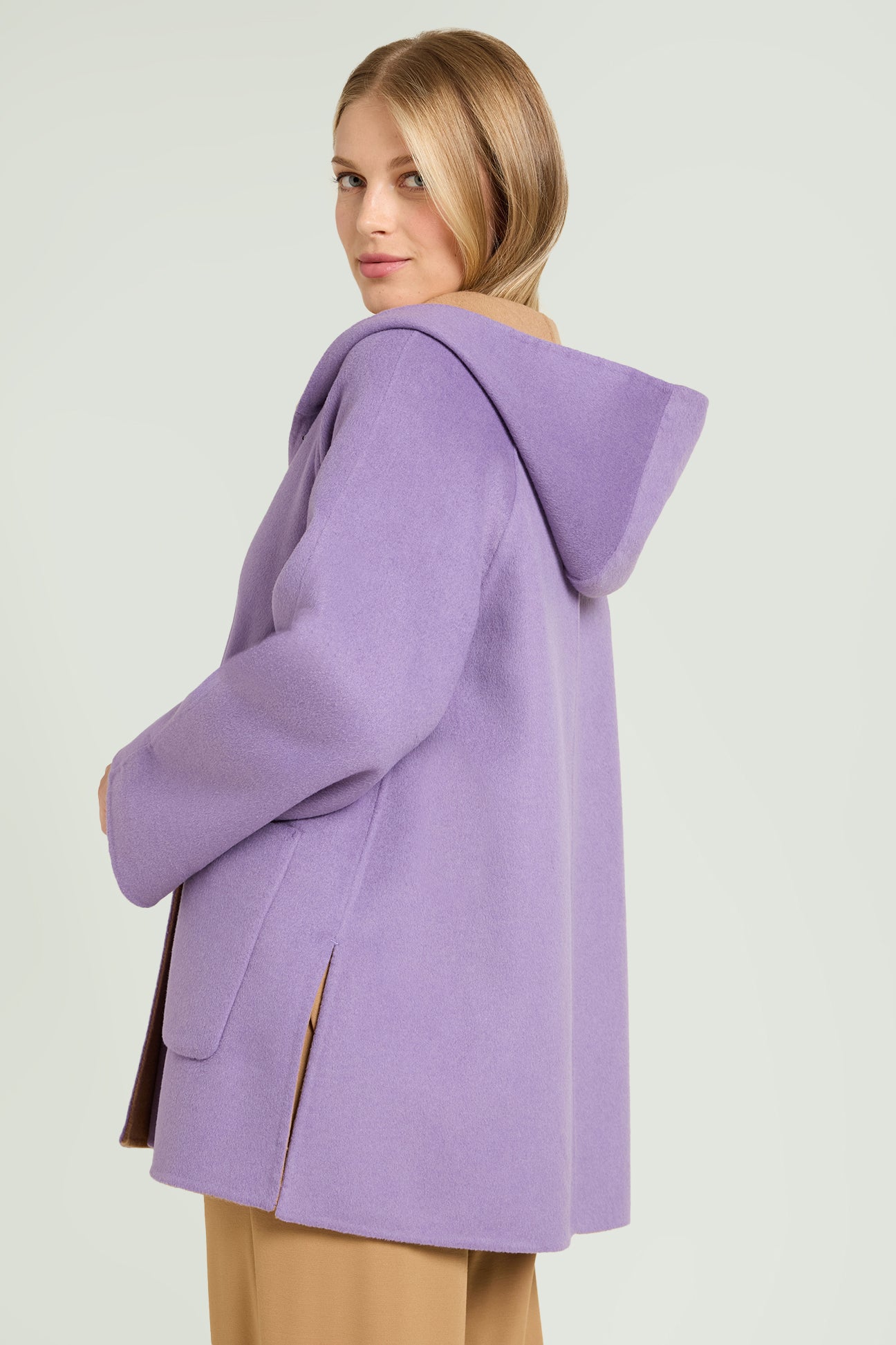 Caban con linea leggermente svasata e spacchi laterali, realizzato in un tessuto "double face" che sposa due colori moda: esternamente il malva ed il cammello all'interno. Collo a cappuccio, chiusura con bottoni automatici gunmetal, tasche applicate. Cucito completamente a mano.