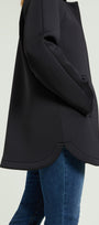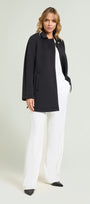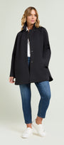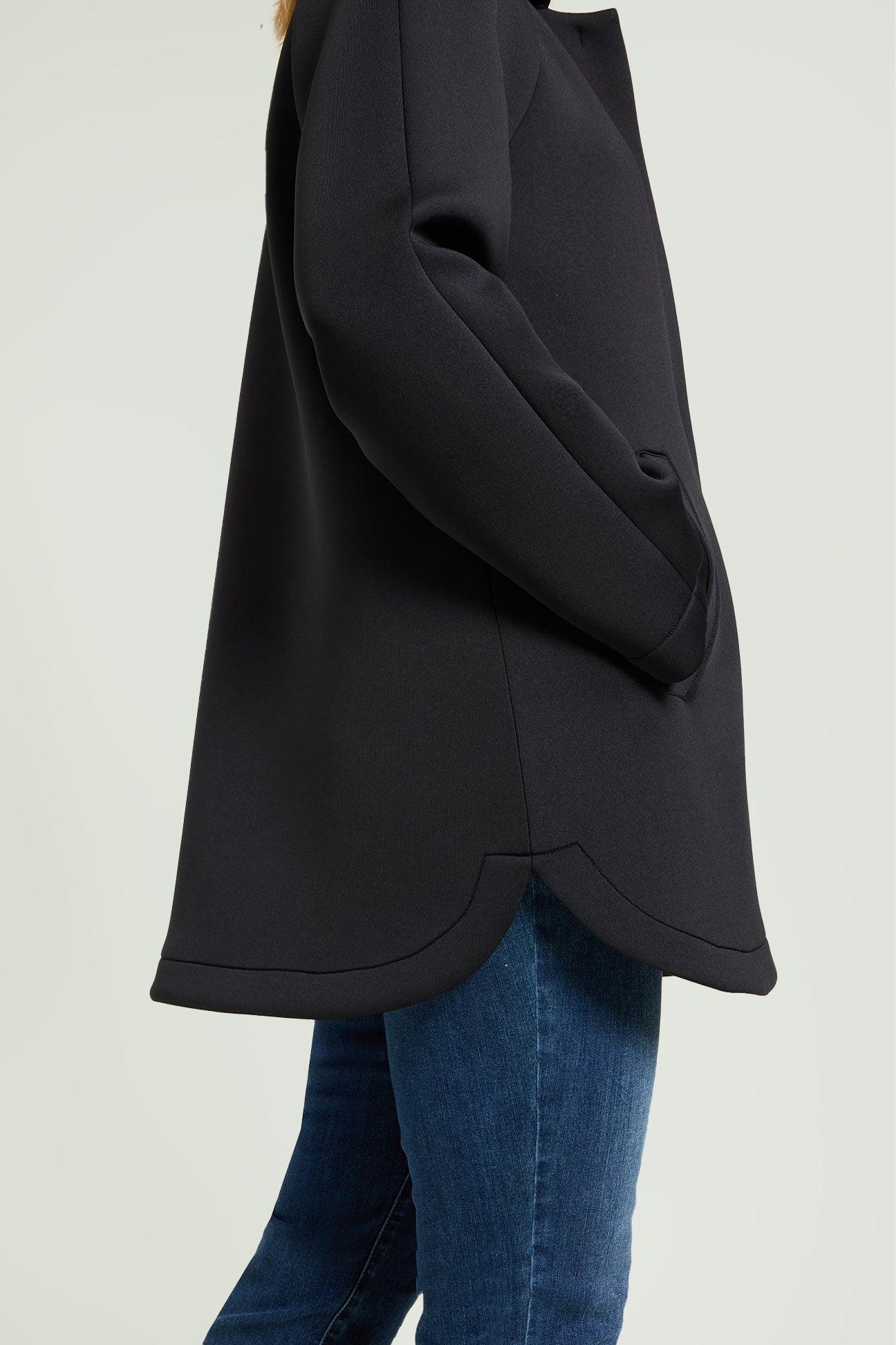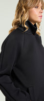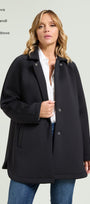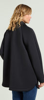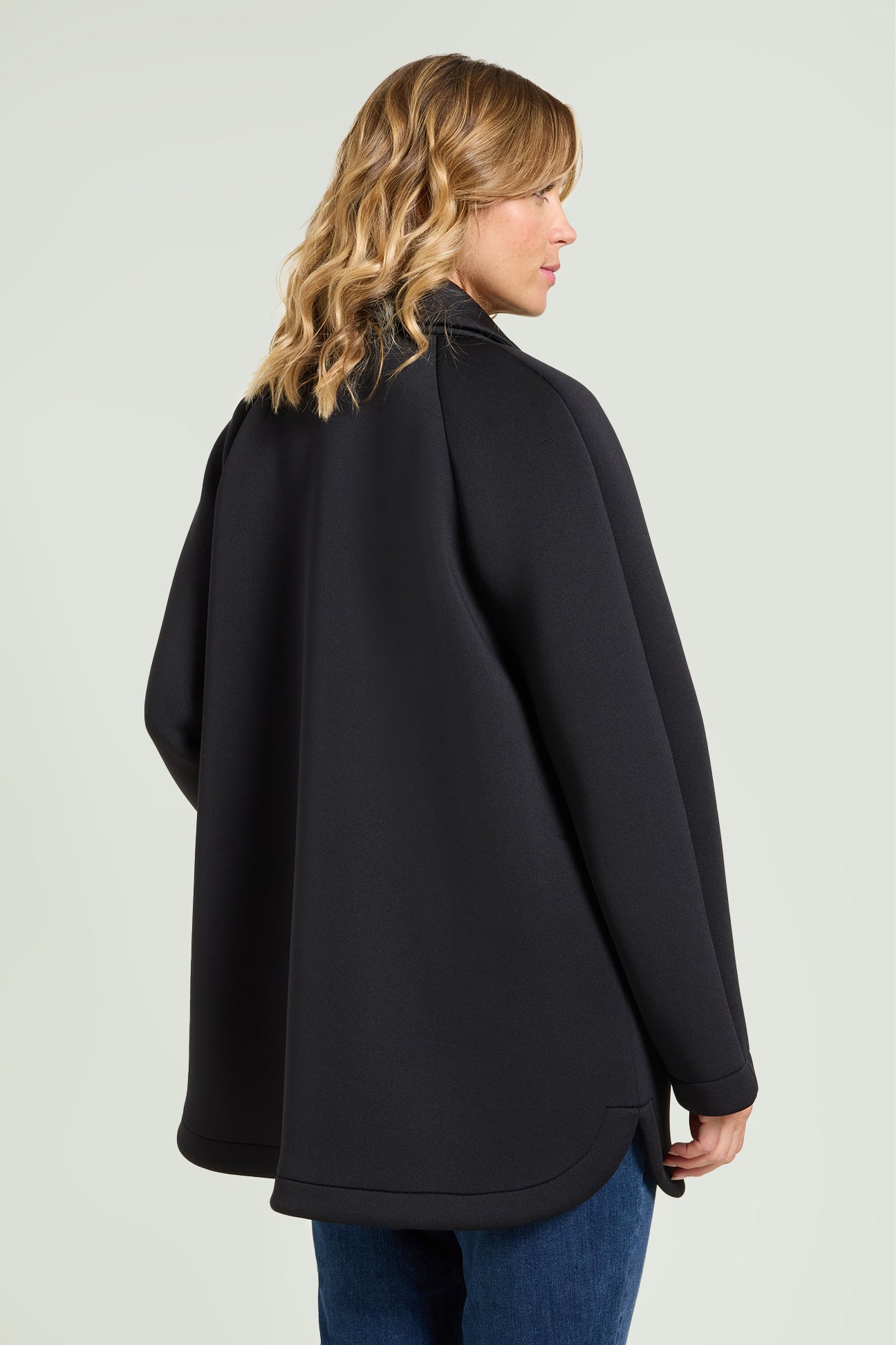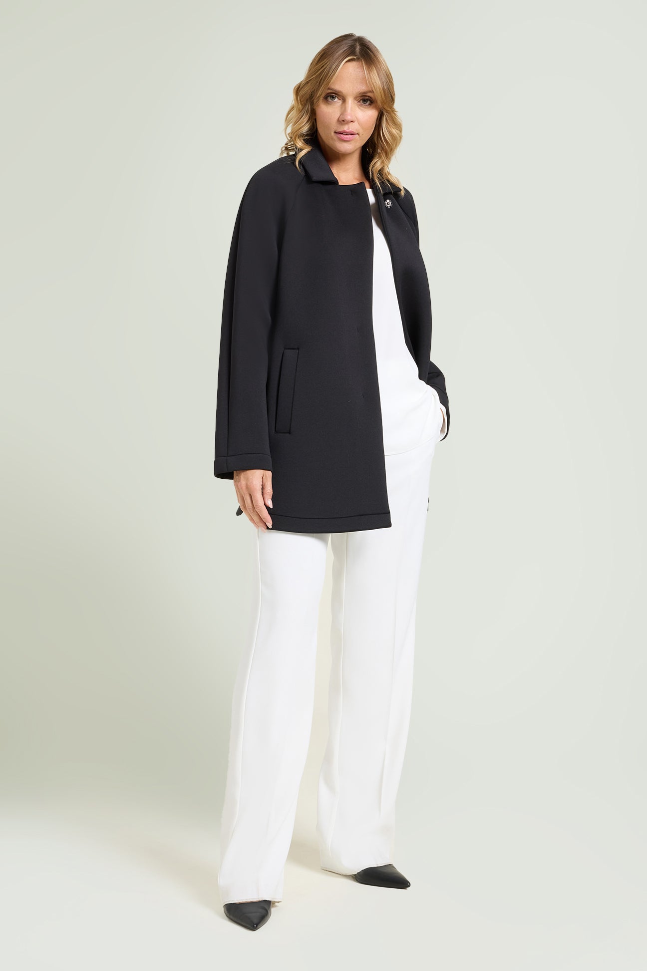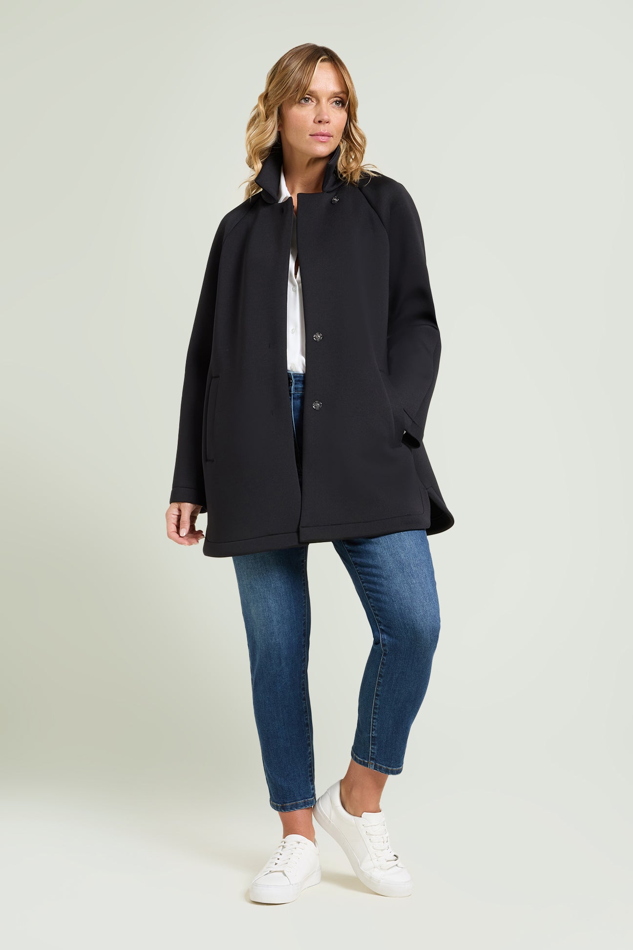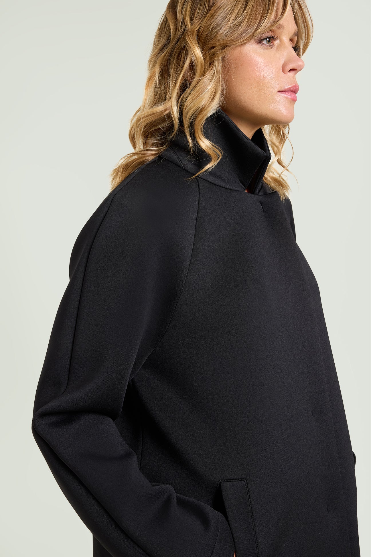 Confortevole caban in Scuba elasticizzato. Taglio raglan, linea leggermente svasata con spacchi laterali stondati, chiusura con bottoni automatici a scomparsa, tasche a filetto, sfoderato.