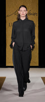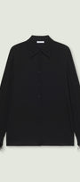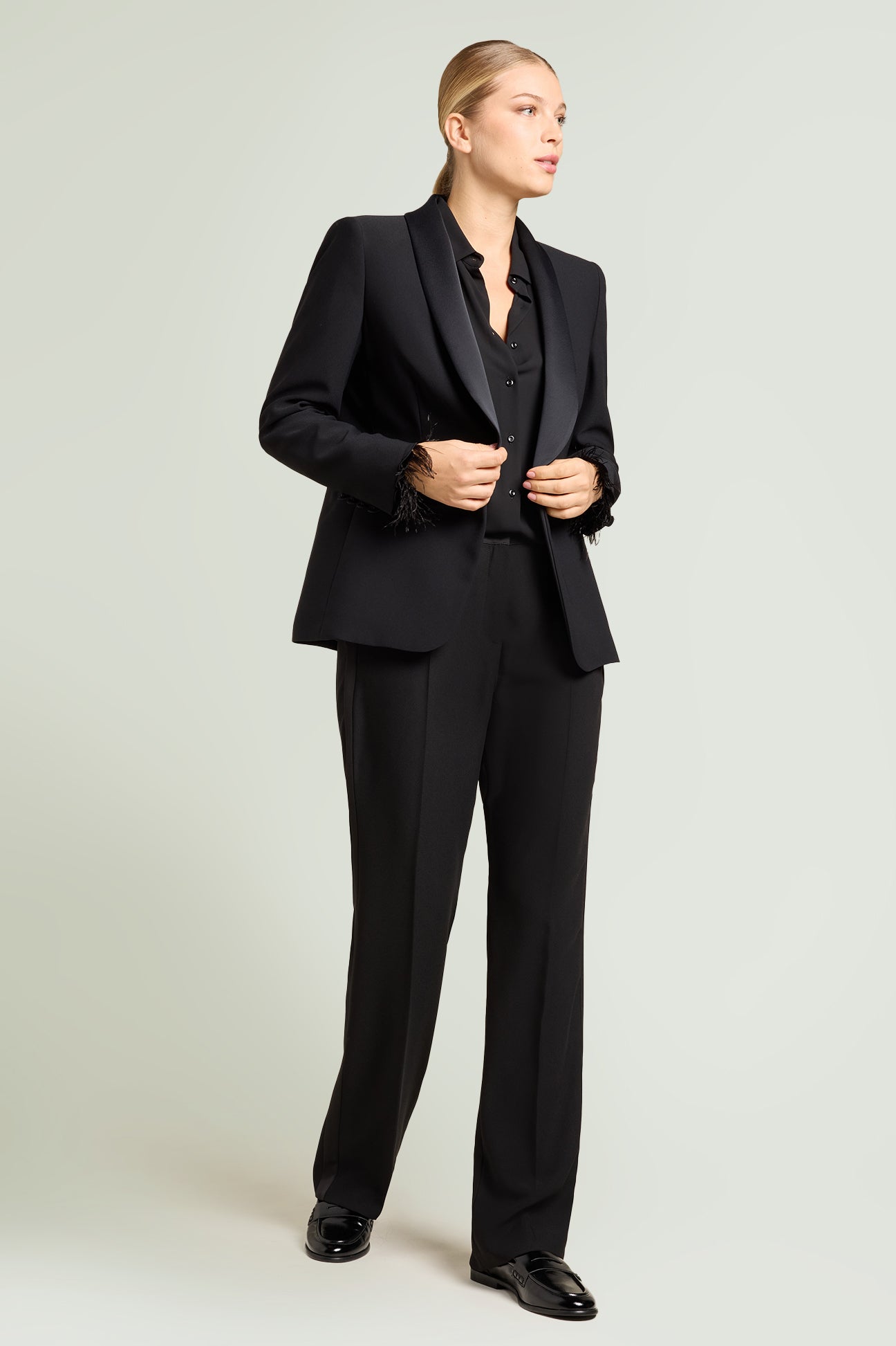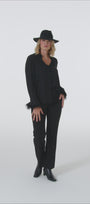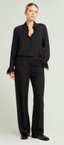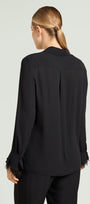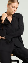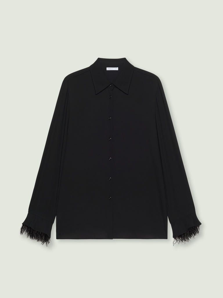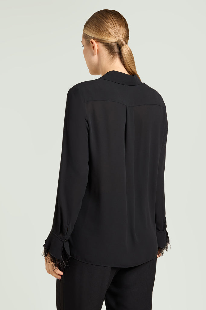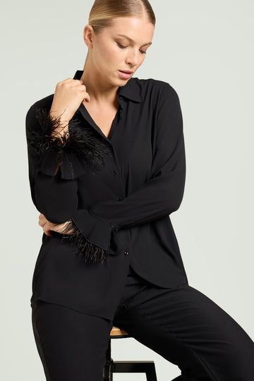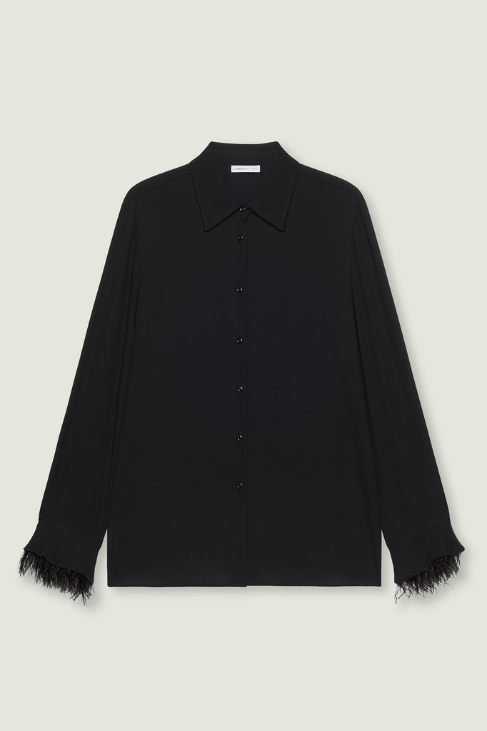 Camicia in marocaine 100% viscosa caratterizzata da polsi con dettaglio in piume marabù. Linea dritta, colletto con listino, chiusura con asole e bottoni, dietro con doppio carrè e soffietto.
