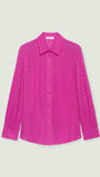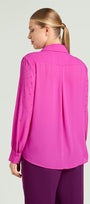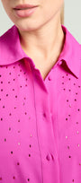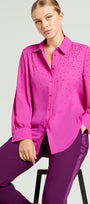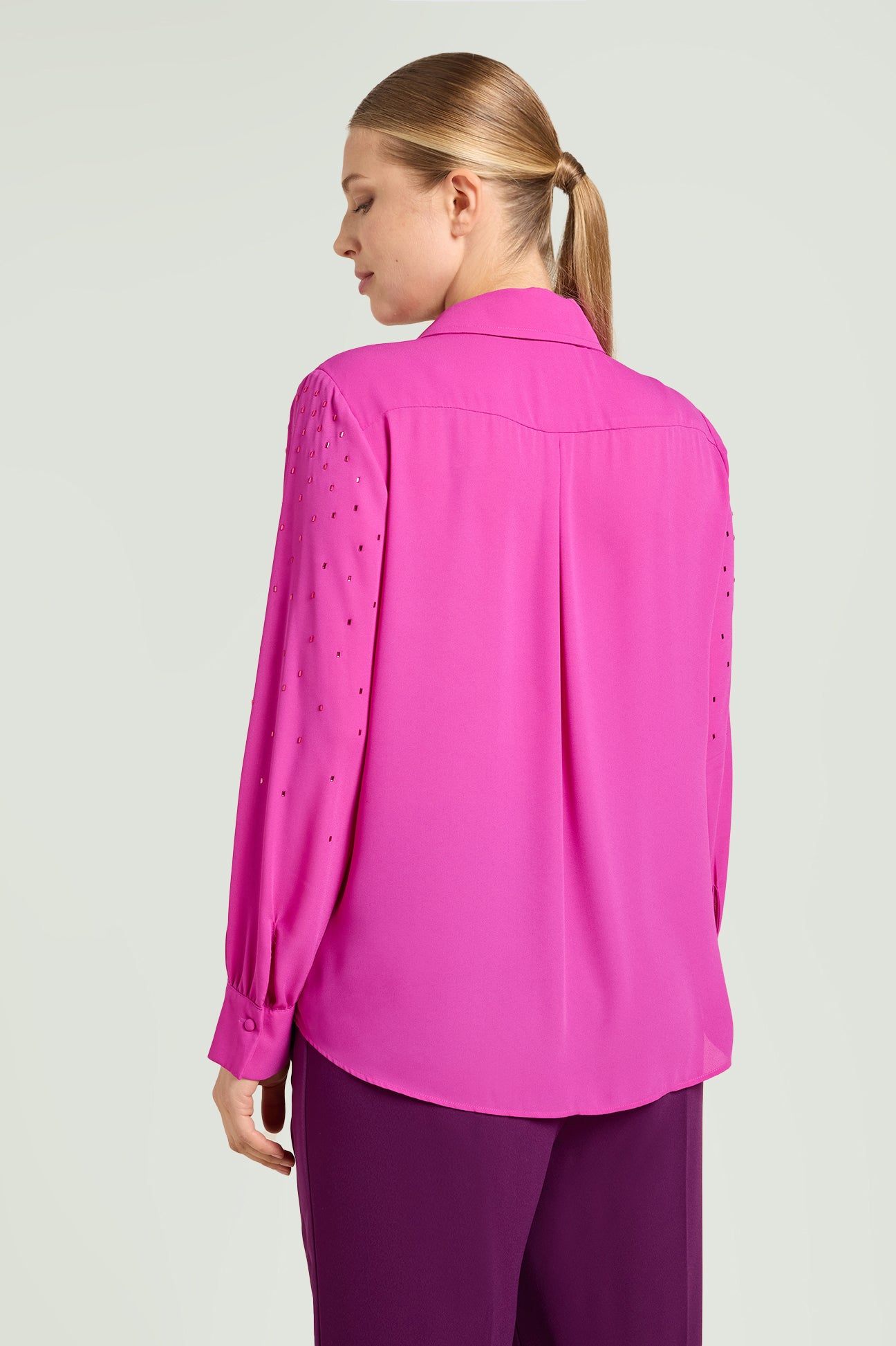Camicia in doppia georgette caratterizzata da una pioggia di luminose baguette in tinta su davanti e maniche. Linea dritta con fondo stondato, colletto con listino, dietro con carrè doppio e soffietto combaciante, maniche lunghe con polso, bottoni foderati in tessuto.