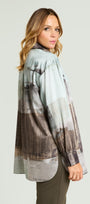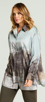 Camicia protagonista con vestibilità comoda in raso stampato. Collo con listino, chiusura con asole e bottoni, maniche con polso, dietro con doppio carrè e soffietto, spacchi stondati.