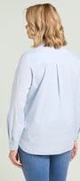 Camicia in popeline dalla linea dritta con spacchi laterali stondati. Tessuto elasticizzato. Colletto e listino, chiusura con asole e bottoni, manica lunga con polso, dietro con carrè doppio e soffietto.