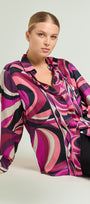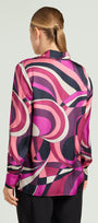 Camicia fantasia in satin con linea dritta e spaccchi laterali. Colletto con listino, chiusura con asole e bottoni, manica lunga con polso.