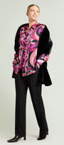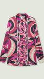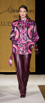 Tocchi di rosa, fucsia, porpora e burgundy illuminati dall'avorio e da pennellate di nero. Un capo esclusivo della collezione "Mara Venier per Luisa Viola".