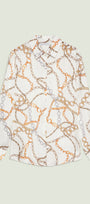 Un intreccio elegante di catene e anelli dorati scorre sul tessuto come un gioiello leggero. Il fondo chiaro valorizza il disegno, mentre le sfumature calde dell’oro si alternano a delicati accenti di colore, creando una stampa di carattere e senza tempo. Una stampa esclusiva Luisa Viola.