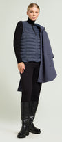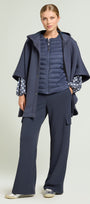 La cappa è in scuba stretch, con il cappuccio foderato in nylon. Chiusura davanti con bottoni automatici in metallo e sui fianchi con bottone in tinta a 4 fori. Tasche inclinate, sfoderata. Il gilet è in nylon trapuntato con imbottitura fake down, paricollo, con zip. Dettagli metallici con finitura gunmetal, bottoni e tiretti personalizzati con il logo "V" di Luisa Viola. Disponibile anche nella versione sabbia.