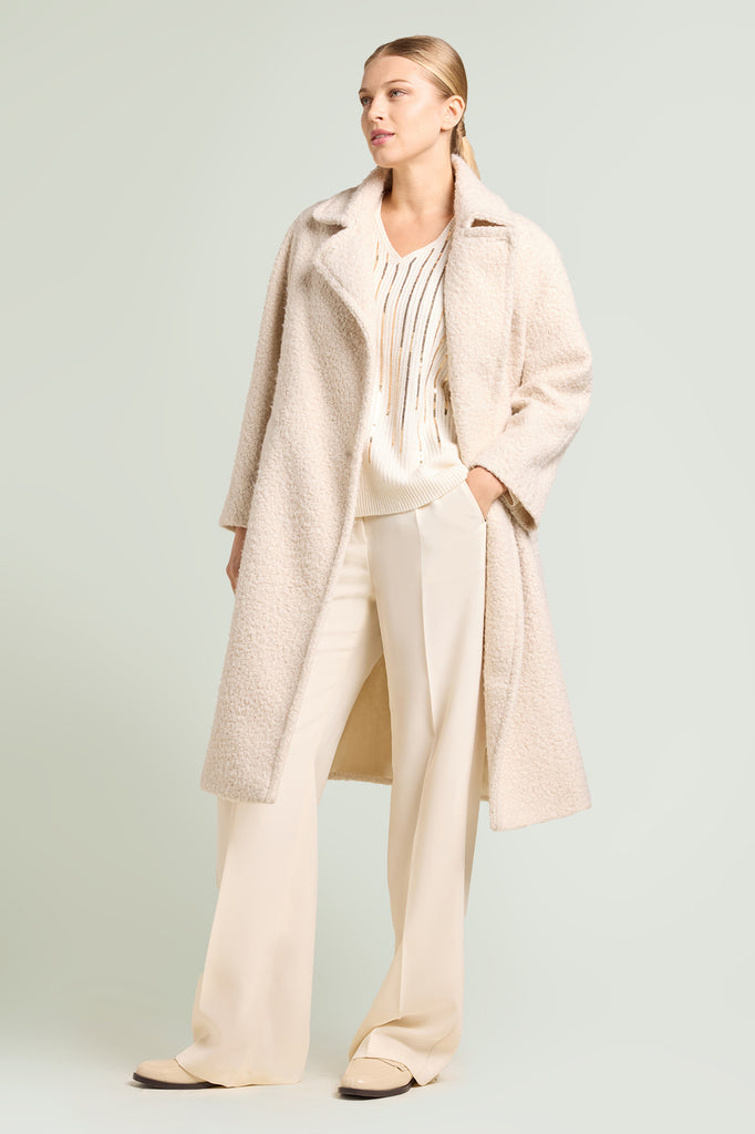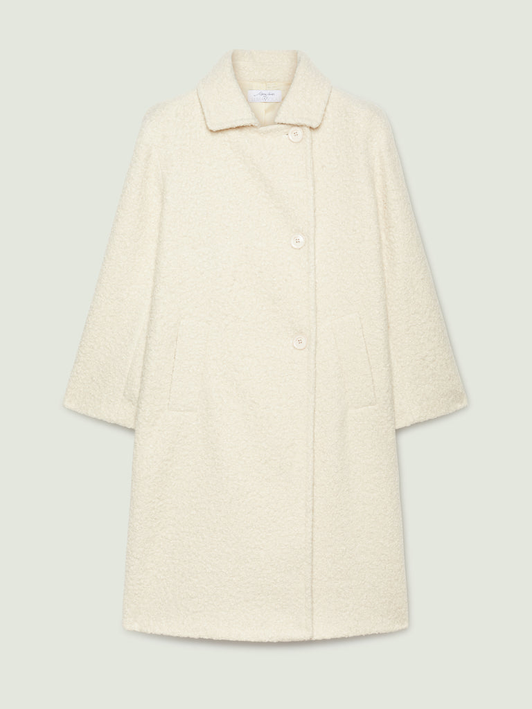 Cappotto in tessuto effetto orsetto dalla linea comfort. Collo e rever doppio uso, da portare sia con collo chiuso che aperto, chiusura con asole e bottoni, tasche, foderato.