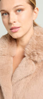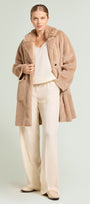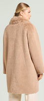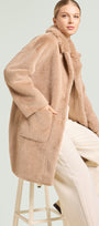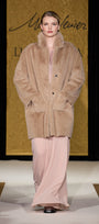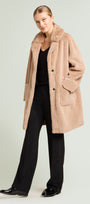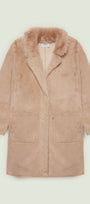 Cappotto dècontractè realizzato in un soffice tessuto double face: dal lato esterno a pelo lungo ed internamente con effetto scamosciato. Linea morbida, collo e rever, tasche applicate, chiusura con bottoni automatici cuciti a mano, sfoderato.