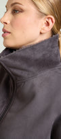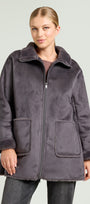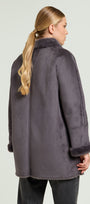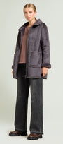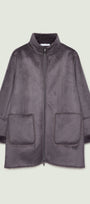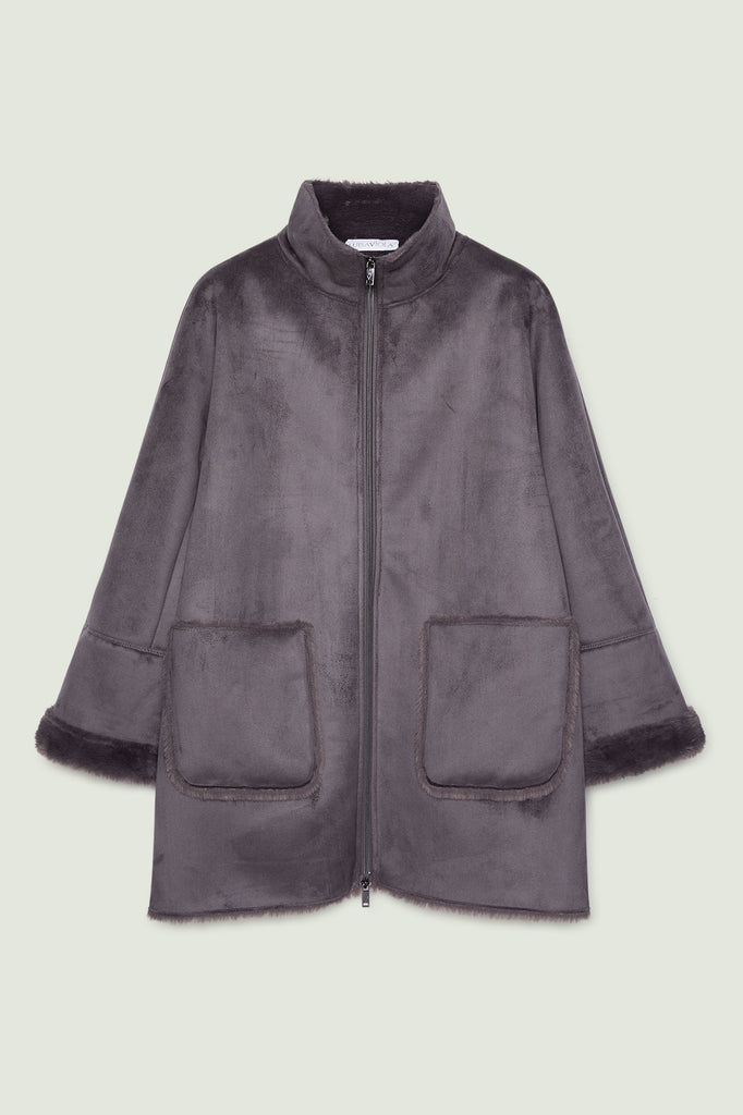 Cappotto dècontractè, realizzato con un soffice tessuto double face: dal lato interno a pelo lungo ed esternamente con effetto scamosciato. Taglio chimono, linea dritta con cuciture a "taglio vivo", tasche applicate, collo a listino, chiusura con zip a doppio cursore. Tiretti in metallo con finitura "gunmetal", personalizzati con il logo "V" di Luisa Viola.