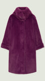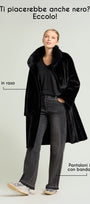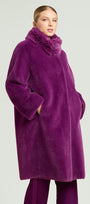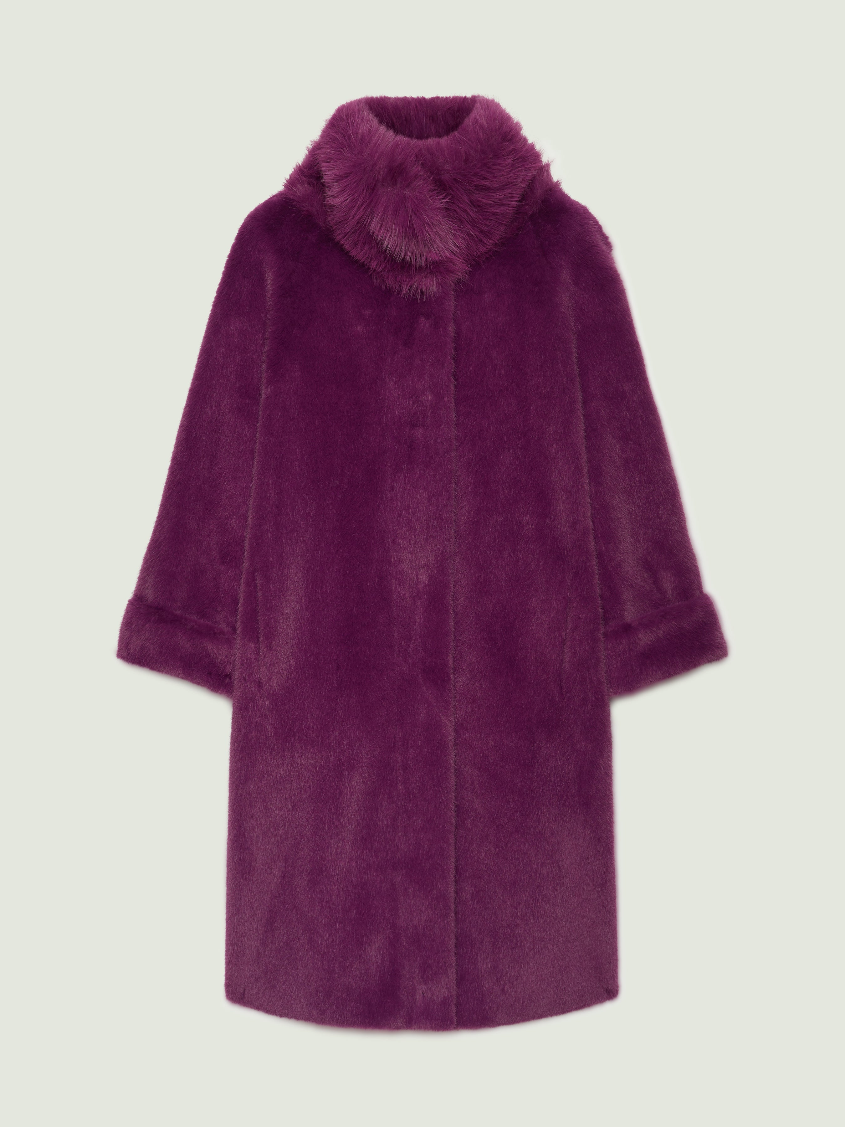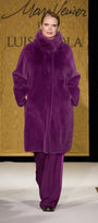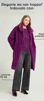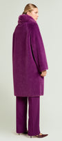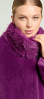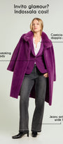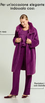 Cappotto dècontractè, realizzato in un soffice tessuto double face: dal lato esterno a pelo lungo ed internamente con effetto scamosciato. Linea morbida, collo in piedi, tasche, fondo manica con possibilità di risvolto, sfoderato. Disponibile in nero e nel nuovo colore Porpora.