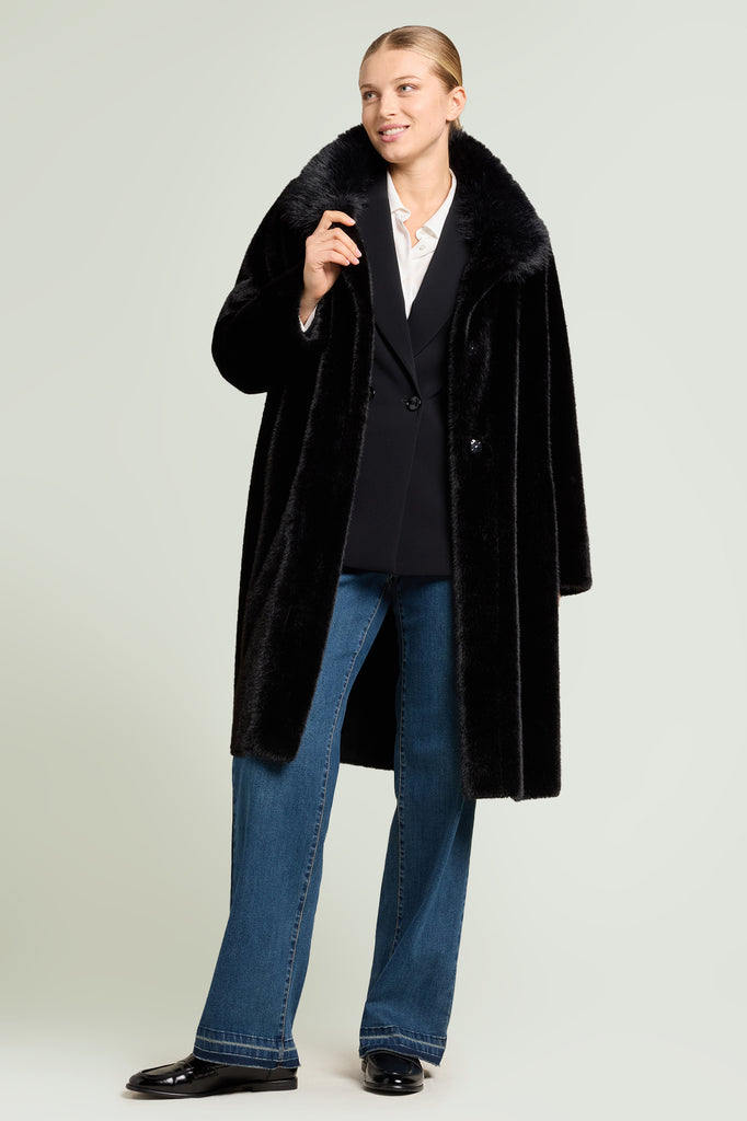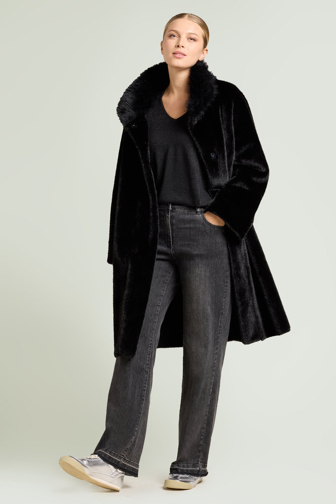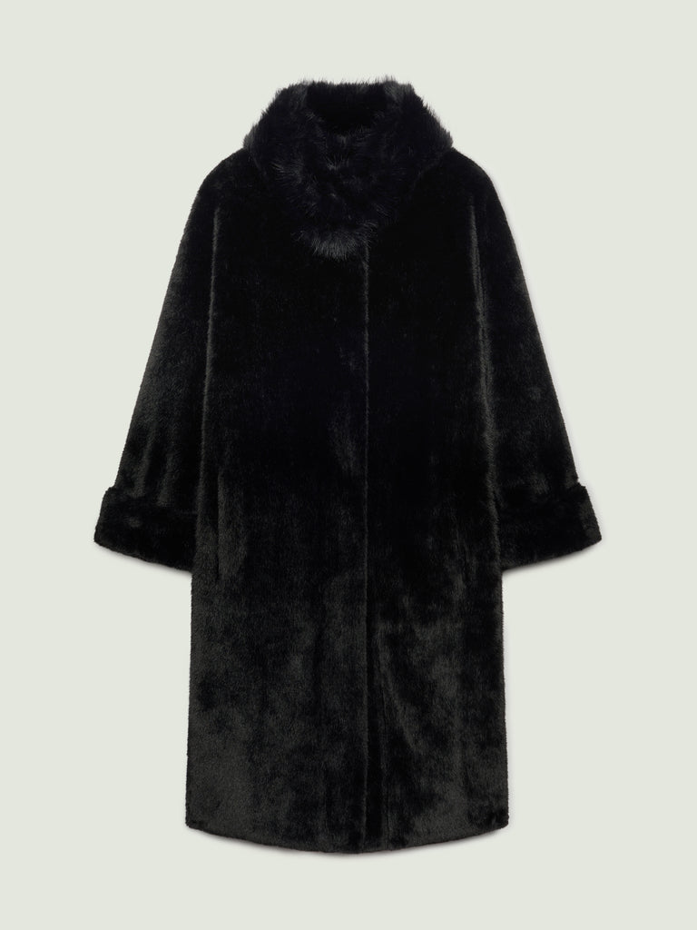 Cappotto dècontractè, realizzato in un soffice tessuto double face: dal lato esterno a pelo lungo ed internamente con effetto scamosciato. Linea morbida, collo in piedi, tasche, fondo manica con possibilità di risvolto, sfoderato. Disponibile in nero e nel nuovo colore Porpora.