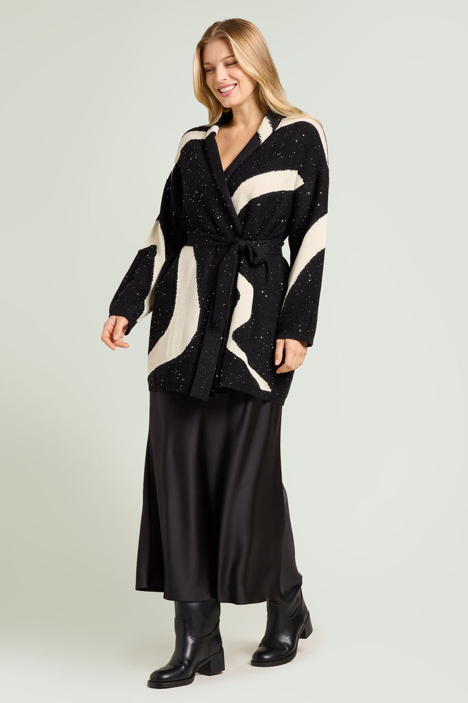 Una "cardigan capolavoro" con un'elaborata lavorazione ad intarsio, dove la lana si alterna ad un soffice filato impreziosito da micro pailllettes. Scollo sciallato, punto rovescio in finezza 7 con bordi in costa, cintura.