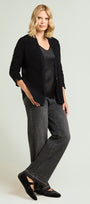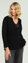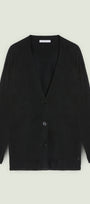 Cardigan in viscosa comfort. Punto rasato in finezza 12 con bordi in costa. Dettagli con filato lurex tono su tono su fondo e polsi, spacchetti laterali e su fondo manica.