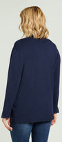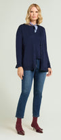 Cardigan in viscosa comfort. Punto rasato in finezza 12 con bordi in costa. Dettagli con filato lurex tono su tono su fondo e polsi, spacchetti laterali e su fondo manica.