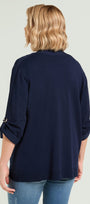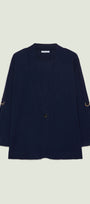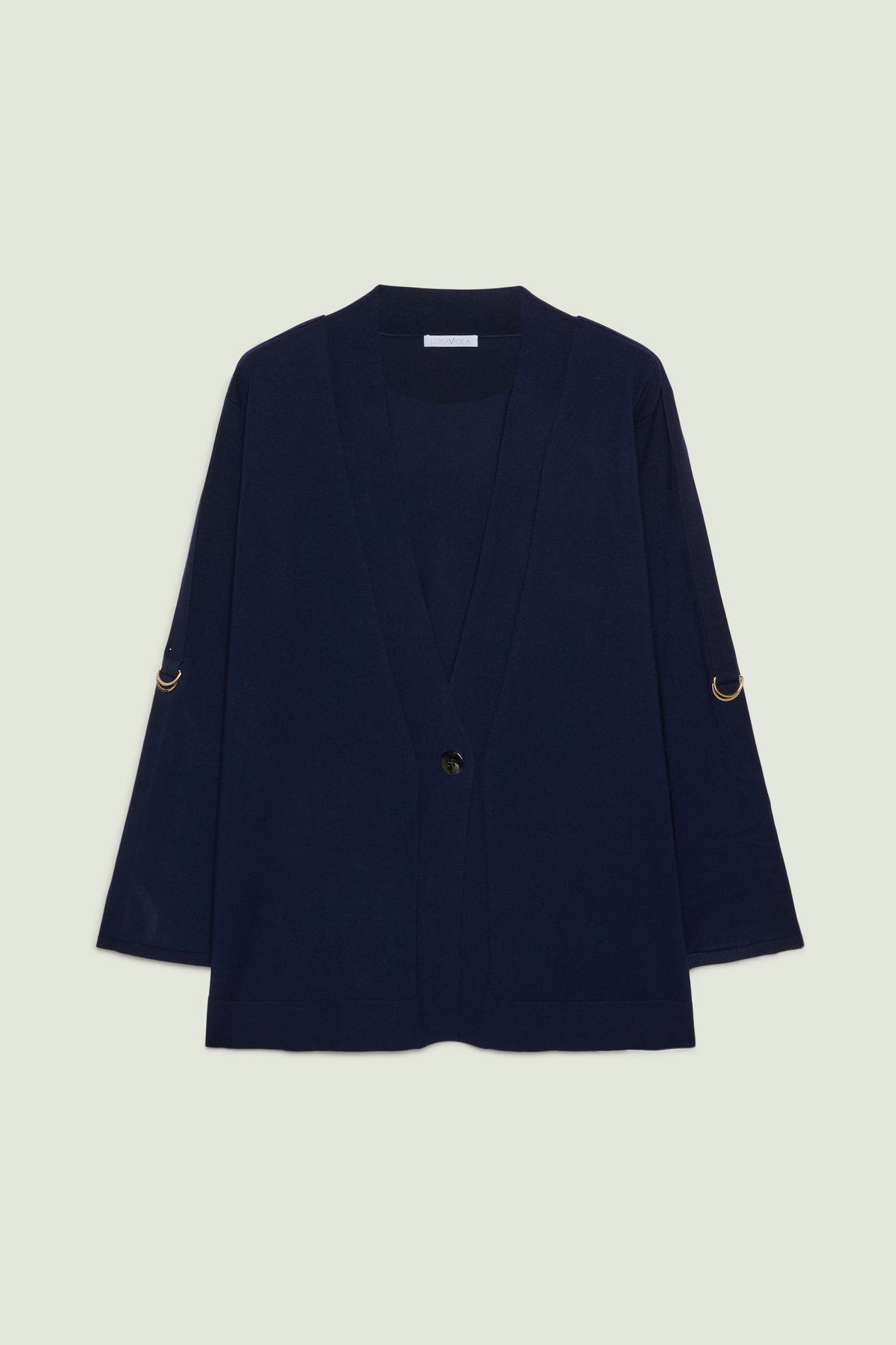 Cardigan unito in viscosa comfort con scollo a "V". Punto rasato in finezza 12 con bordi in costa. Chiusura con asola e bottone. Manica lunga con laccetto e fibbia per poter essere portata risvoltata. Dettagli light gold.