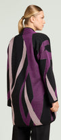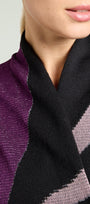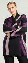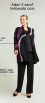 Spolverino fantasia in tricot realizzato con tecnica piquet jacquard: un elaborato disegno in finezza dodici ottenuto con tre fili di colore diverso ed un tocco di lurex. Collo sciallato montante con bordi sfrangiati.