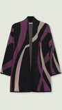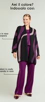 Un disegno che si rifà ai movimenti di avanguardia degli anni 60 legati alle stampe psichedeliche, attraverso le quali veniva rappresentata appieno una certa ricerca di novità visiva e concettuale, soprattutto nel contesto del jet-set della moda di alta classe internazionale. Disegni dove linee sinuose, onde, spirali e curve davano una sensazione di movimento, di cambiamento. In questa reinterpretazione il nero si sposa a tocchi di rosa e di porpora, colori moda della fall/winter '25, donando al capo un'allure contemporaneo di grande carattere.