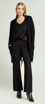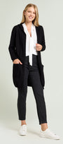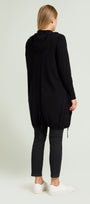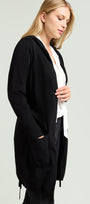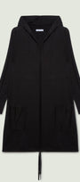 Cardigan in viscosa comfort, punto rasato in finezza 12 con bordi in costa. Cappuccio, tasche e coulisse sul fondo.