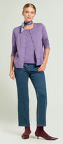 Cardigan paricollo in viscosa comfort realizzato in un blu passepartout. Punto rasato in finezza 12 con bordi in costa e dettagli in filatolurex tono su tono. Giromanica con calature, taschine applicate, fondo manica con spacchetto. Abbinabile a twin set con maglia mezza manica nello stesso filato.