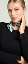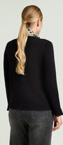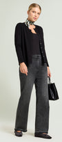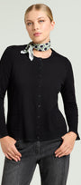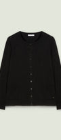 Cardigan paricollo in viscosa comfort nell'irrinunciabile nero. Punto rasato in finezza 12 con bordi in costa e dettagli in filato lurex tono su tono. Giromanica con calature, taschine applicate, fondo manica con spacchetto.