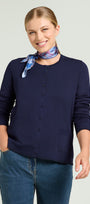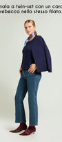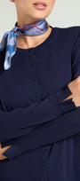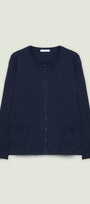 Cardigan paricollo in viscosa comfort realizzato in un blu passepartout. Punto rasato in finezza 12 con bordi in costa e dettagli in filatolurex tono su tono. Giromanica con calature, taschine applicate, fondo manica con spacchetto. Abbinabile a twin set con maglia mezza manica nello stesso filato.