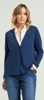 Cardigan in viscosa comfort soft touch realizzato in un delicato rosa cipria. Punto rasato in finezza 12 con bordi in costa, chiusura con bottoni, giromanica con calature, spacchetti laterali. Prezioso ricamo realizzato a mano con castoni e perline in vetro tono su tono.