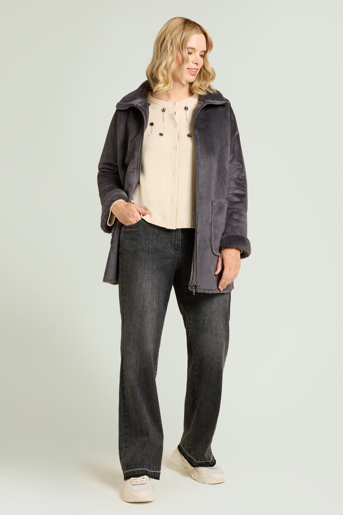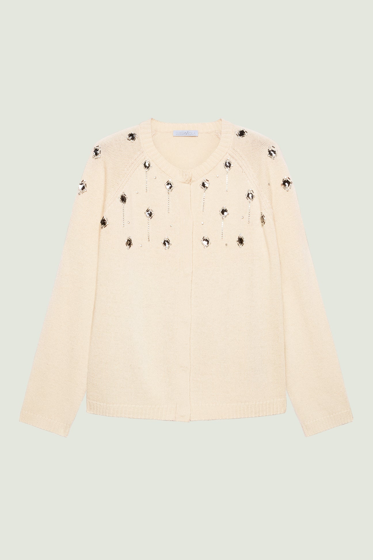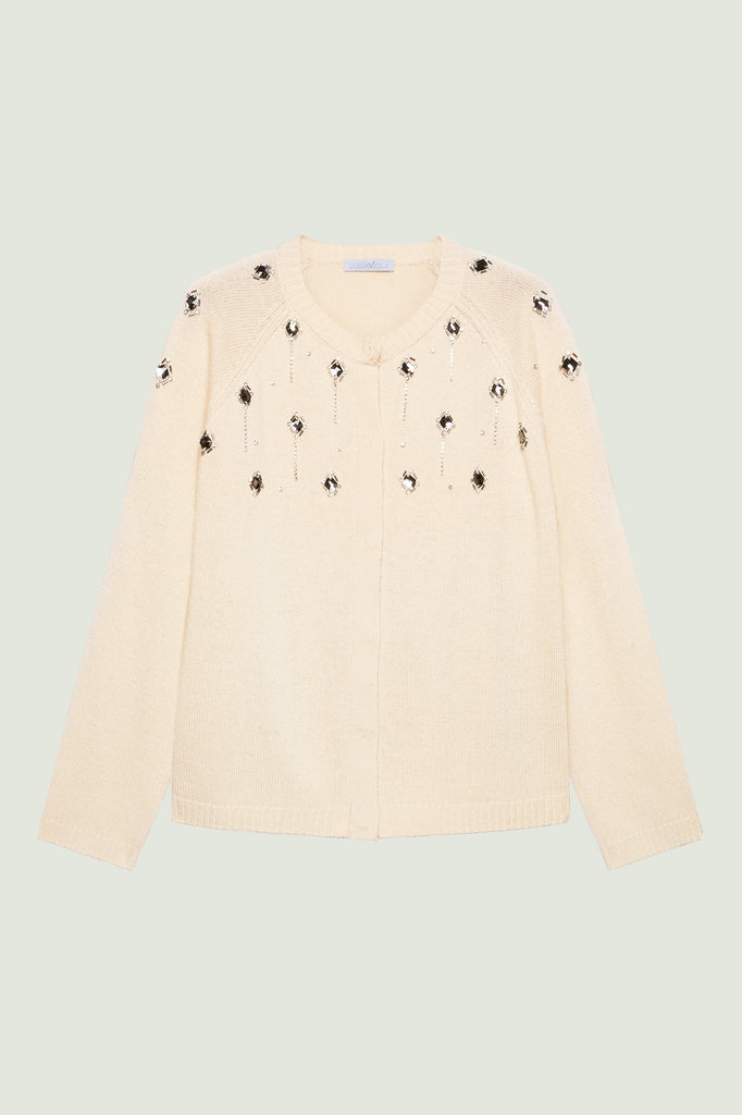 Cardigan in filato misto cashemire con castoni, baguette e strass ricamati a mano. Taglio raglan con calature, punto rasato con bordi in costa, chiusura con bottoni automatici cuciti a mano.
