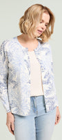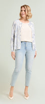 Cardigan fantasia in viscosa comfort con scollo rotondo. Chiusura con asole e bottoni. Punto rasato in finezza 14. Giromanica con calature. Abbinabile a twin set con capi nello stesso filato.