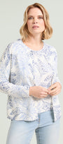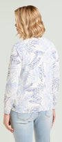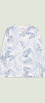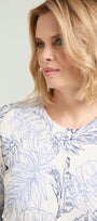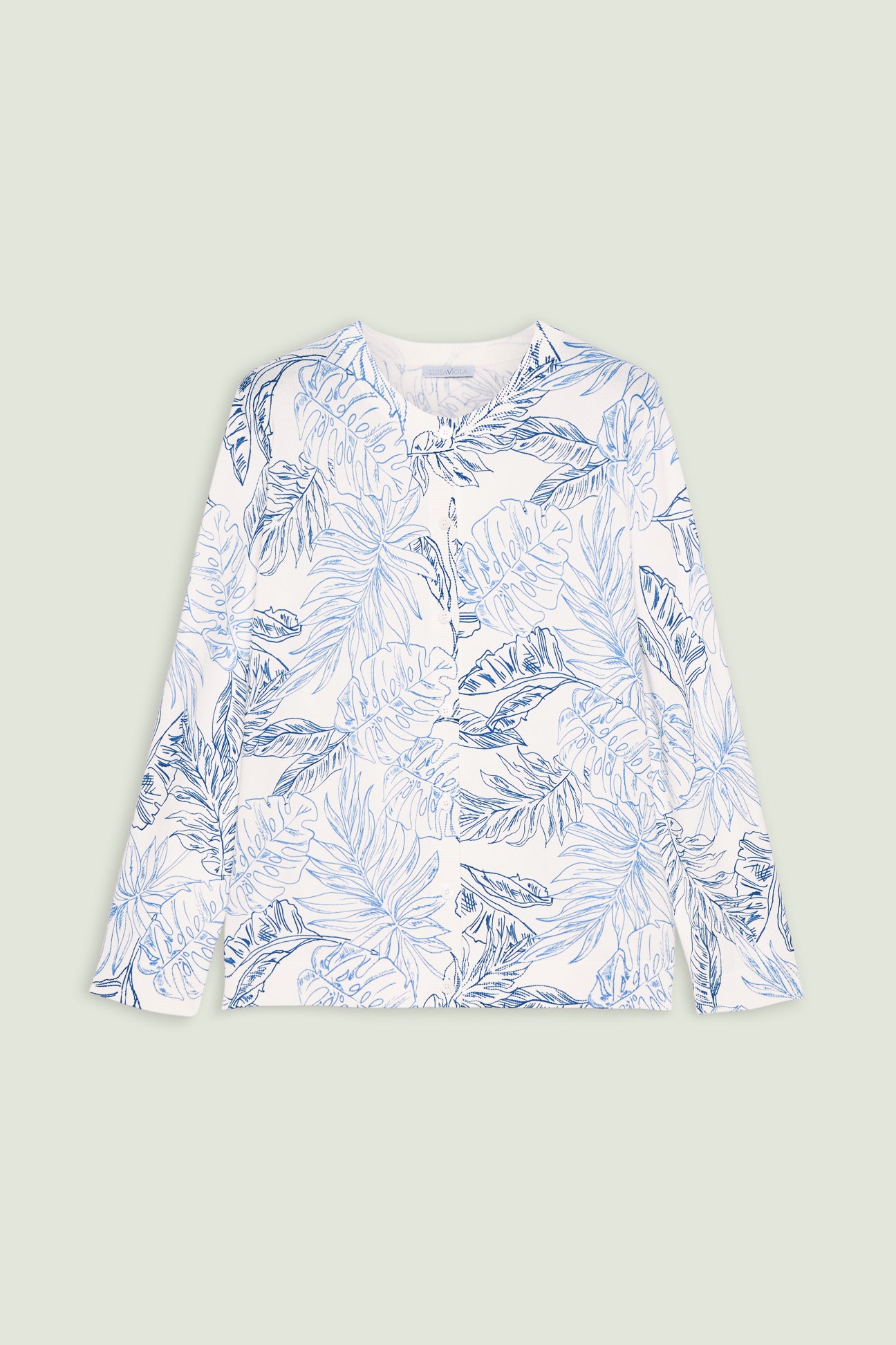 Un susseguirsi di foglie tropicali tracciate come in un delicato schizzo d’artista, dove toni di blu sfumano leggeri su un fondo avorio. Una stampa ariosa e raffinata, che racconta la bella stagione con grazia e naturalezza.