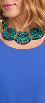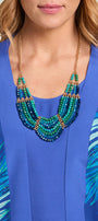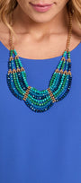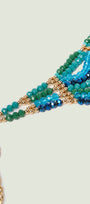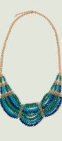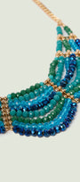 Collana formata da festoni di jais multicolor nei toni dell'azzurro, turchese, blu e verde, trattenuti da perline dorate. La lunghezza regolabile consente di indossarla sia in versione collier che collana. Chiusura con piccolo moschettone. Lunghezza max. cm 75. Le parti dorate sono in metallo anallergico. Gli Jais in vetro colorato.