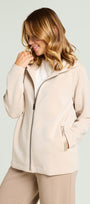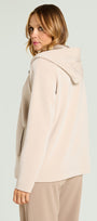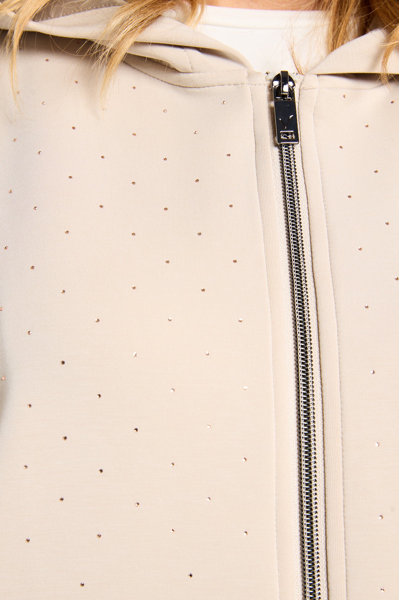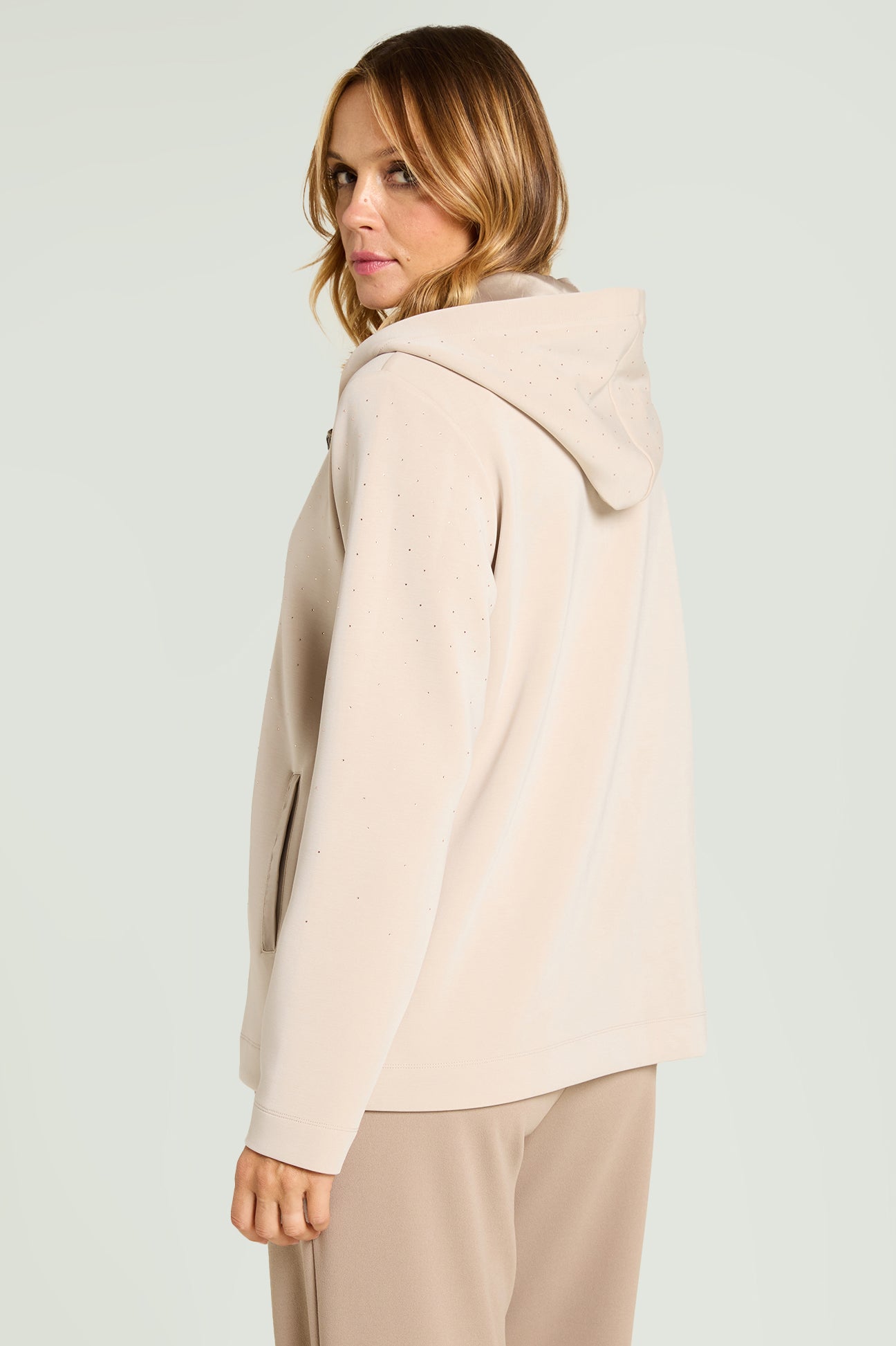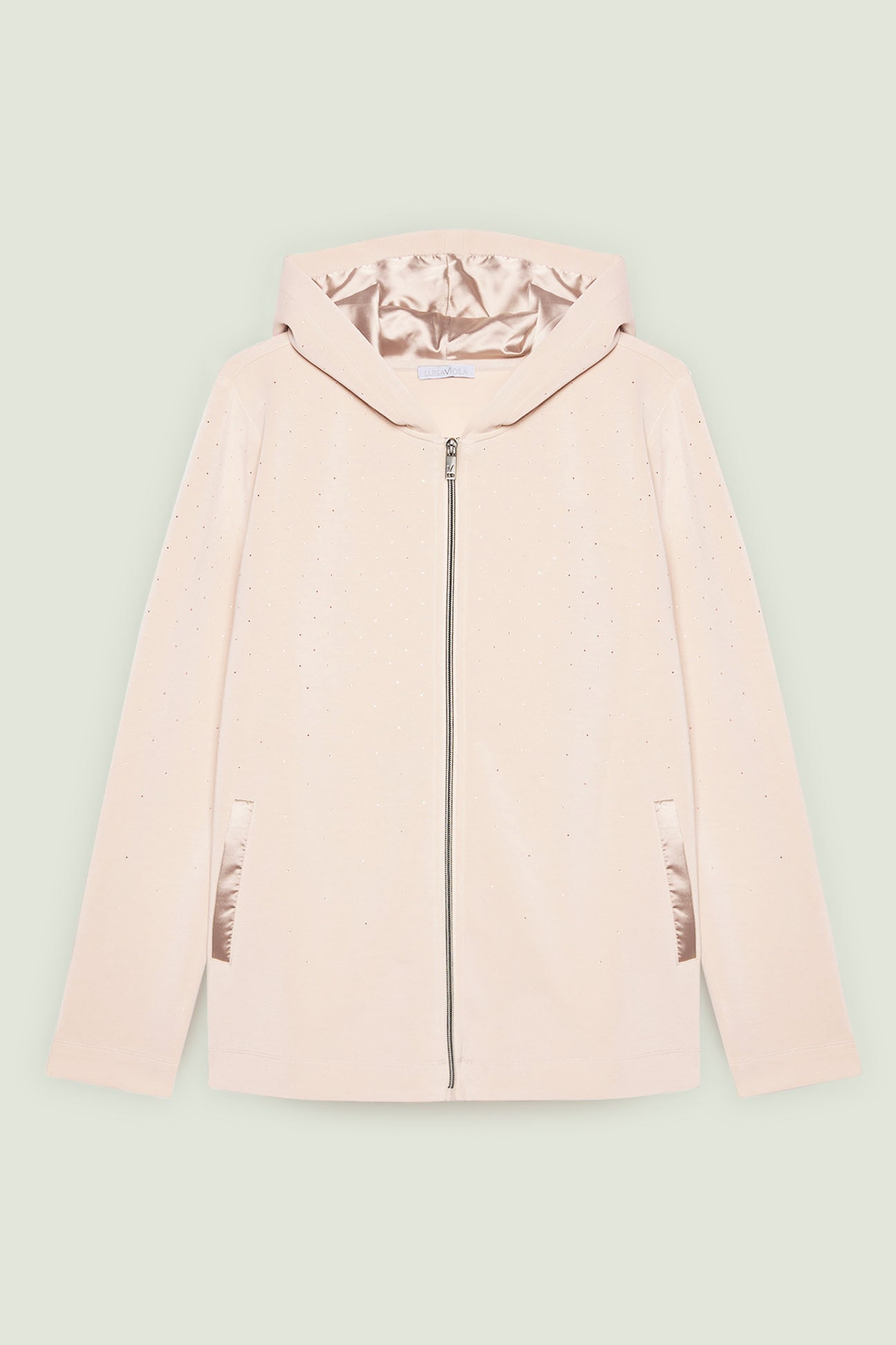 Felpa realizzata in un jersey scuba elasticizzato dalla mano calda e dalla caduta fluida, con una pioggia di microstrass tono su tono. Cappuccio, chiusura con zip, tasche a filetto. Particolari in raso. Tiretto in metallo con finitura gunmetal, personalizzato con il logo "V" di Luisa Viola.