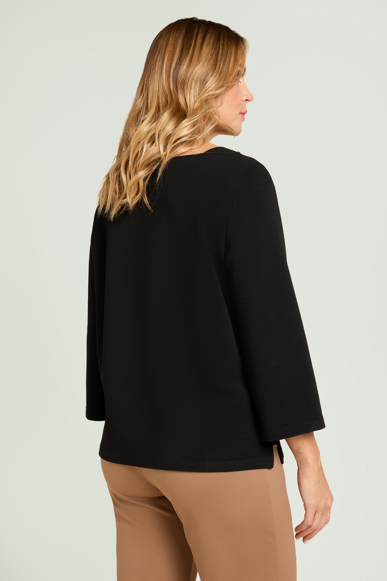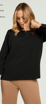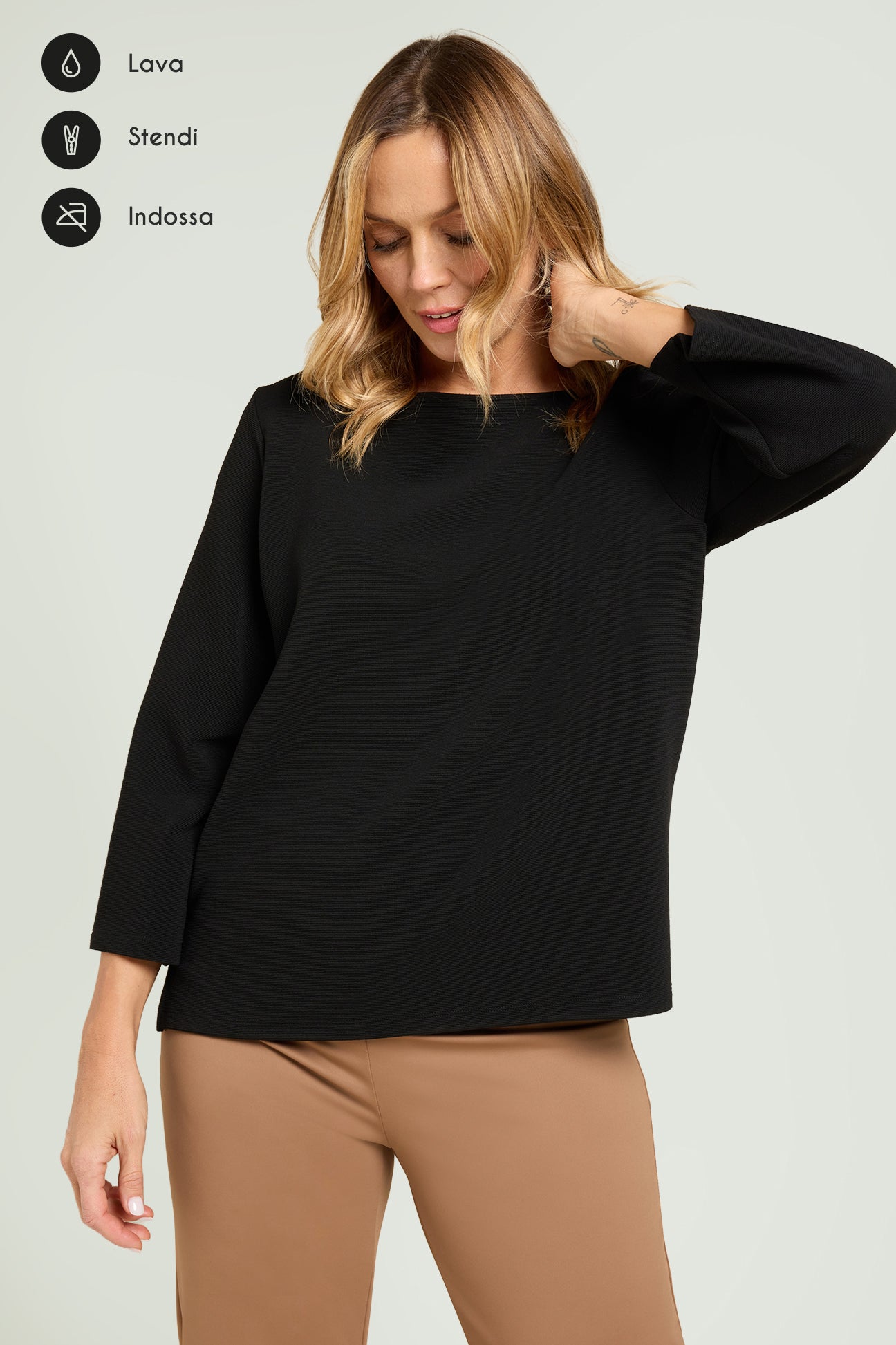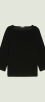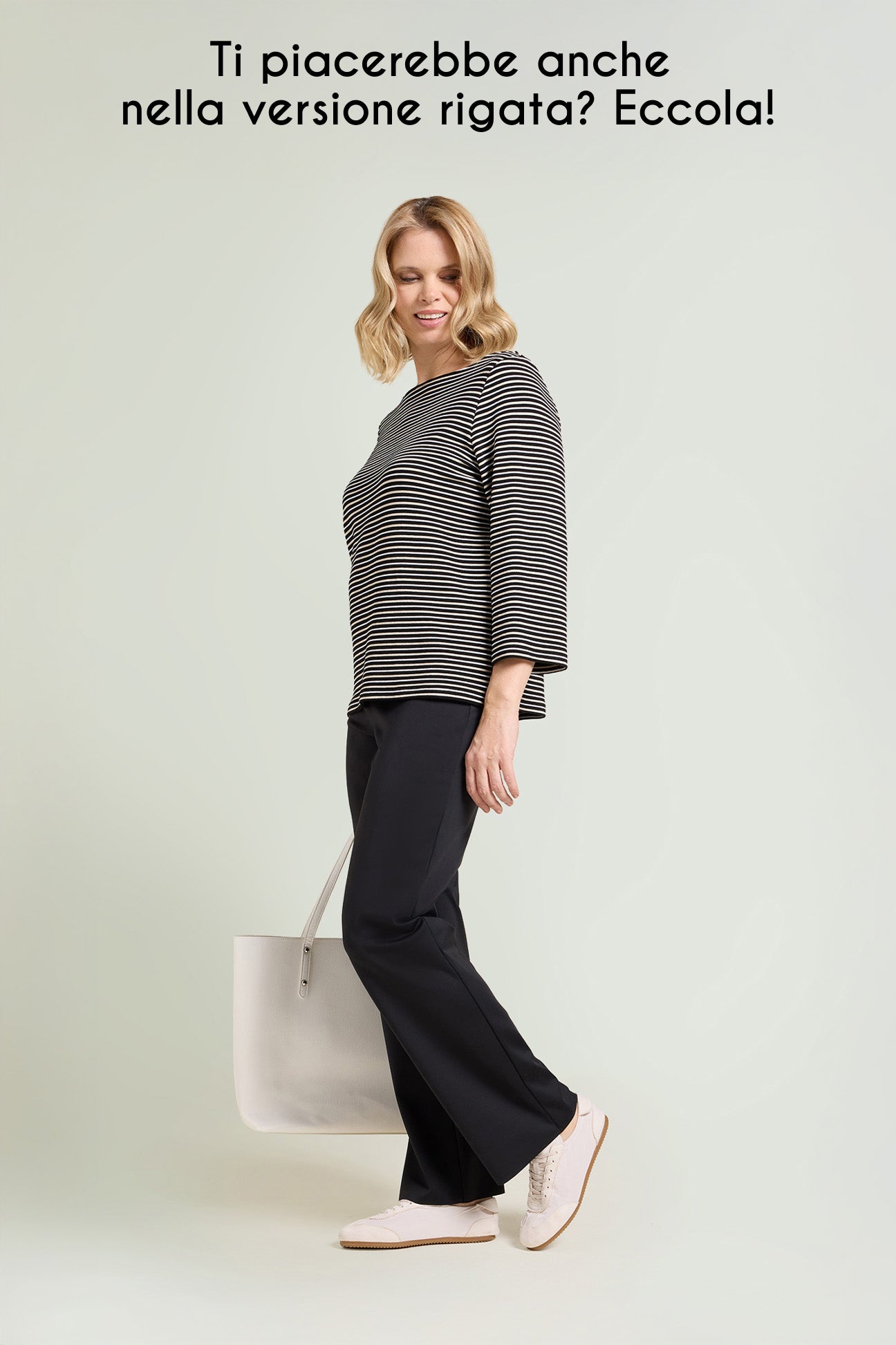 Felpa "marinière" dalla linea boxy con spacchetti laterali, scollatura a barchetta e maniche con lunghezza a tre quarti. Armatura "Ottoman".