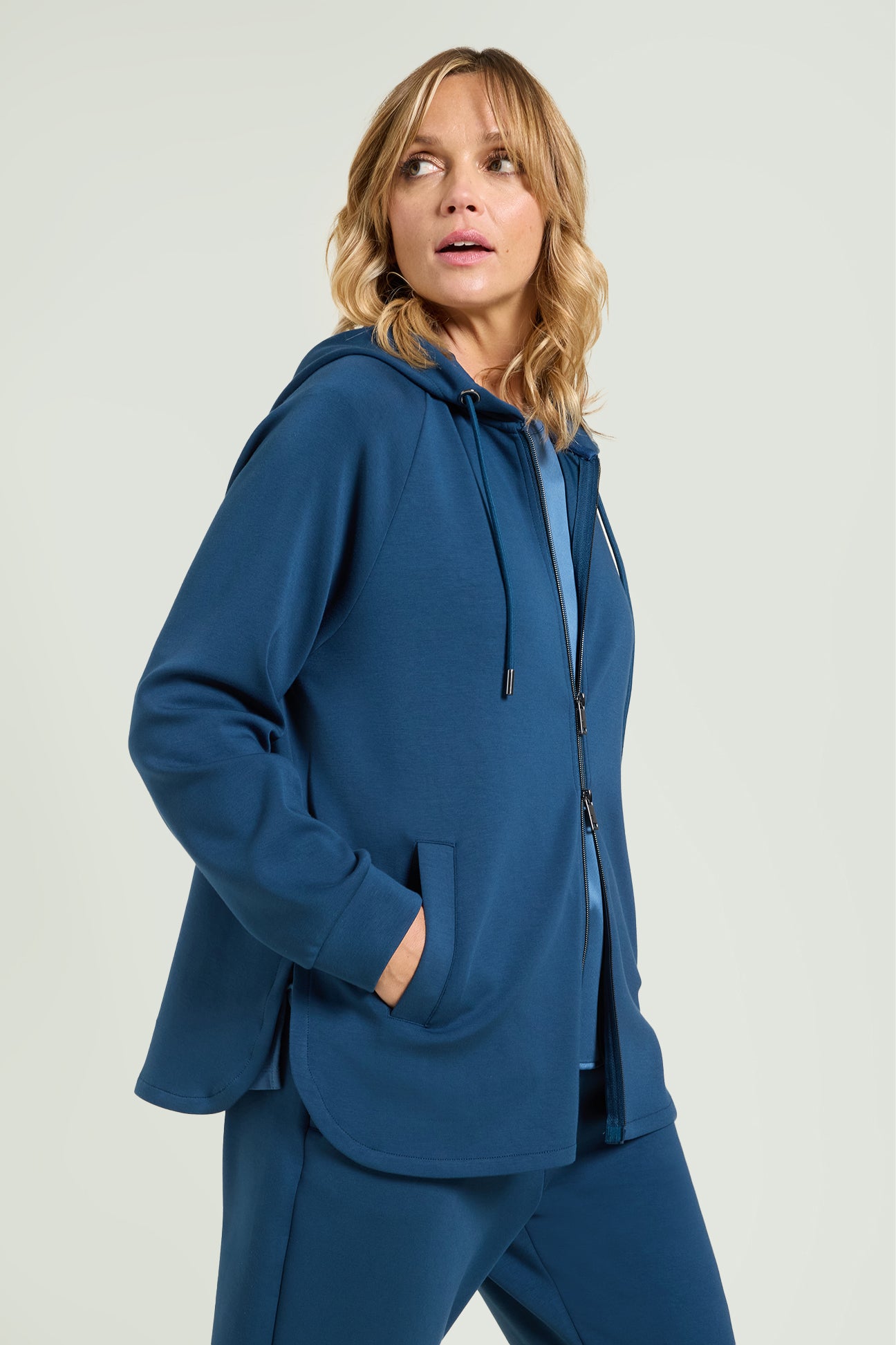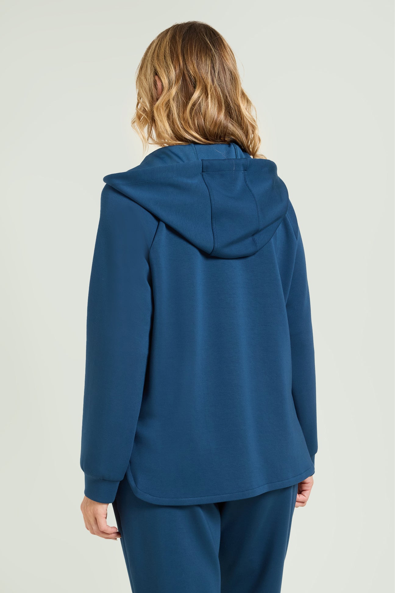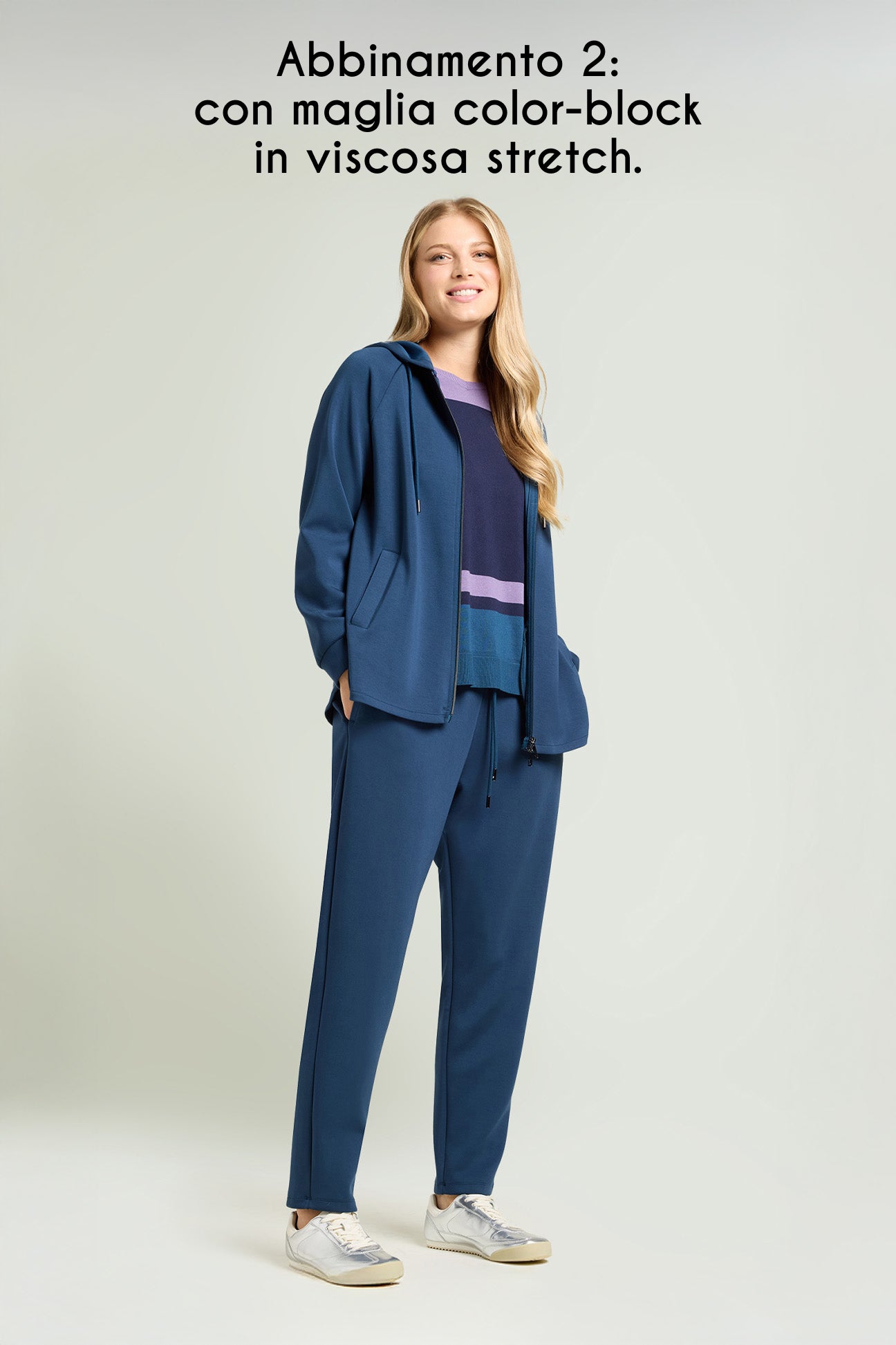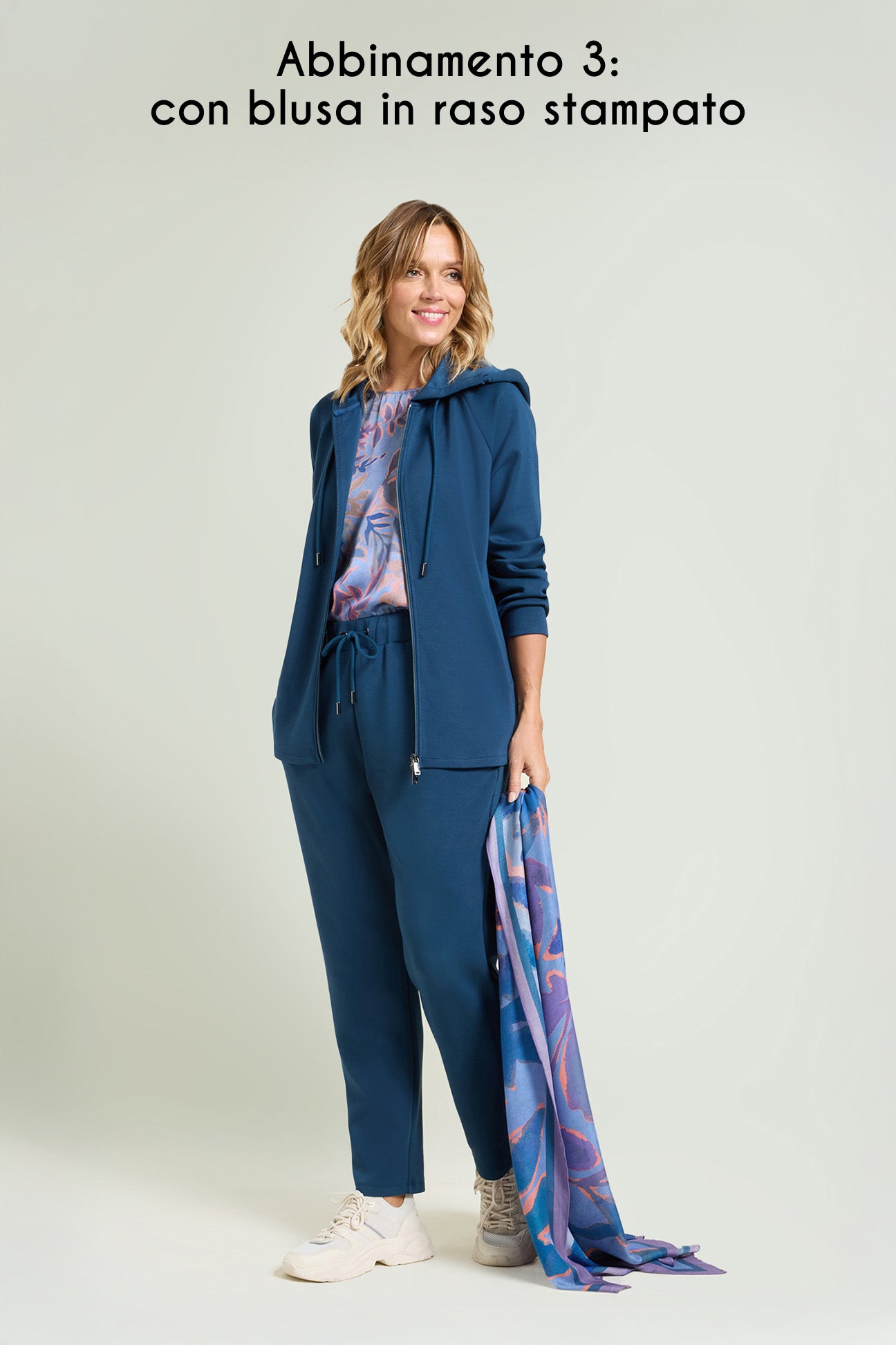 Felpa in jersey scuba soft touch realizzata in uno nuovo blu pavone. Tessuto stretch, taglio raglan, linea leggermente svasata con spacchi stondati, chiusura con zip a doppio cursore, cappuccio coulissato, tasche a filetto, dettagli gunmetal, tiretti con il logo "V" di Luisa Viola. Abbinabile a completo con pantaJogger nello stesso tessuto.