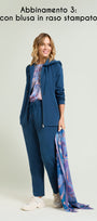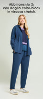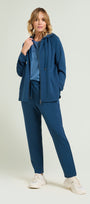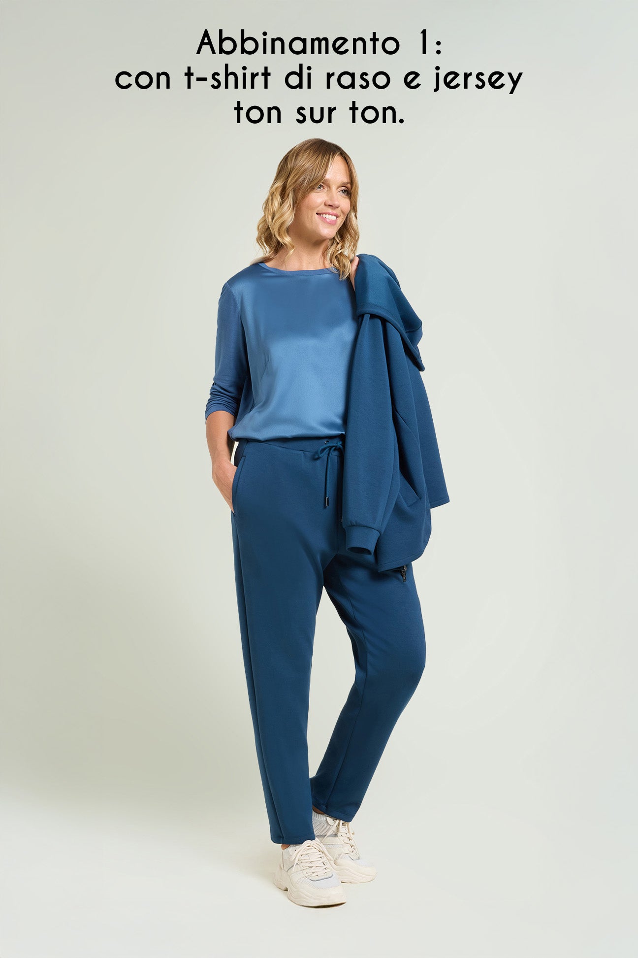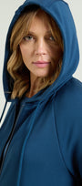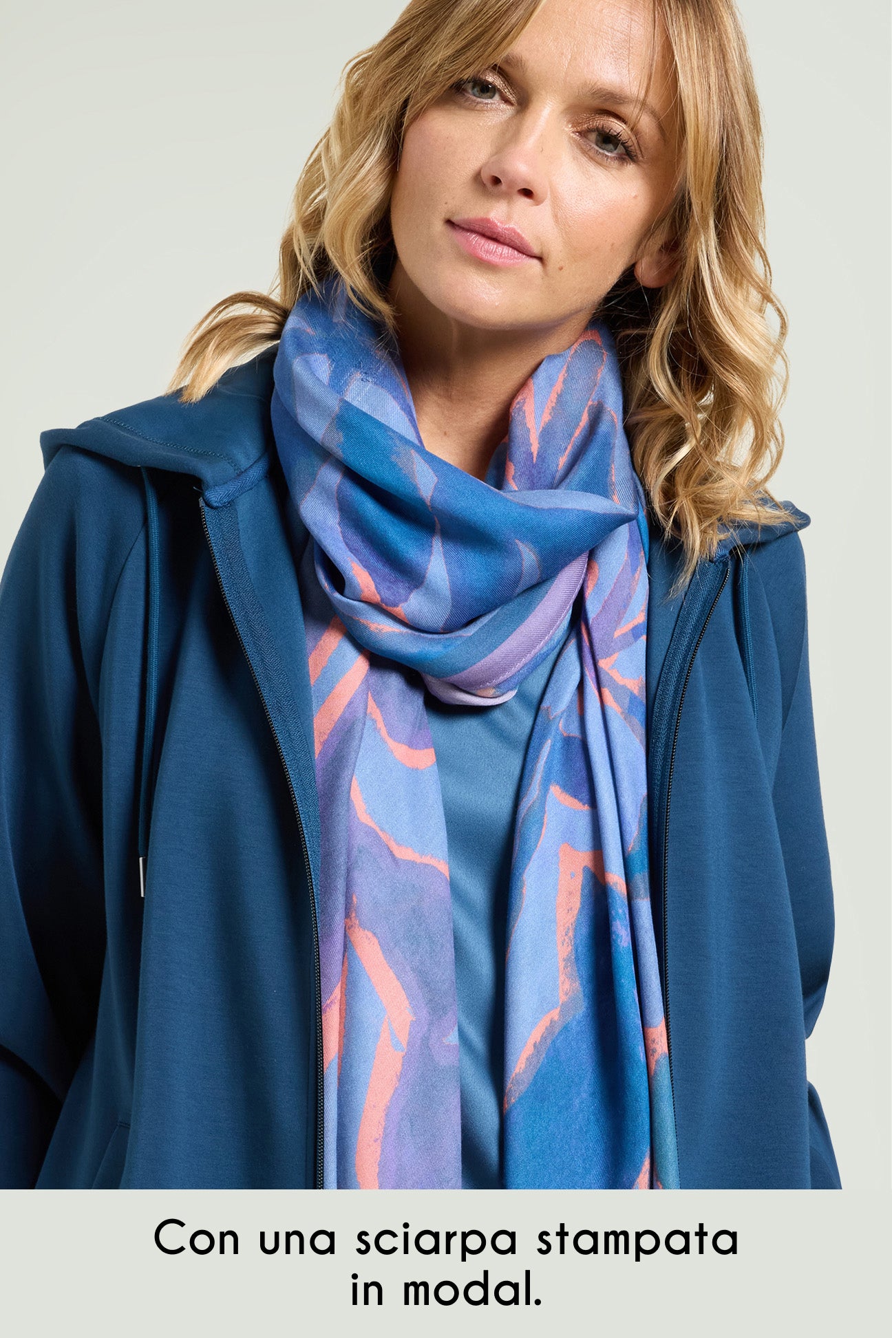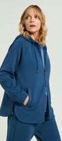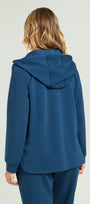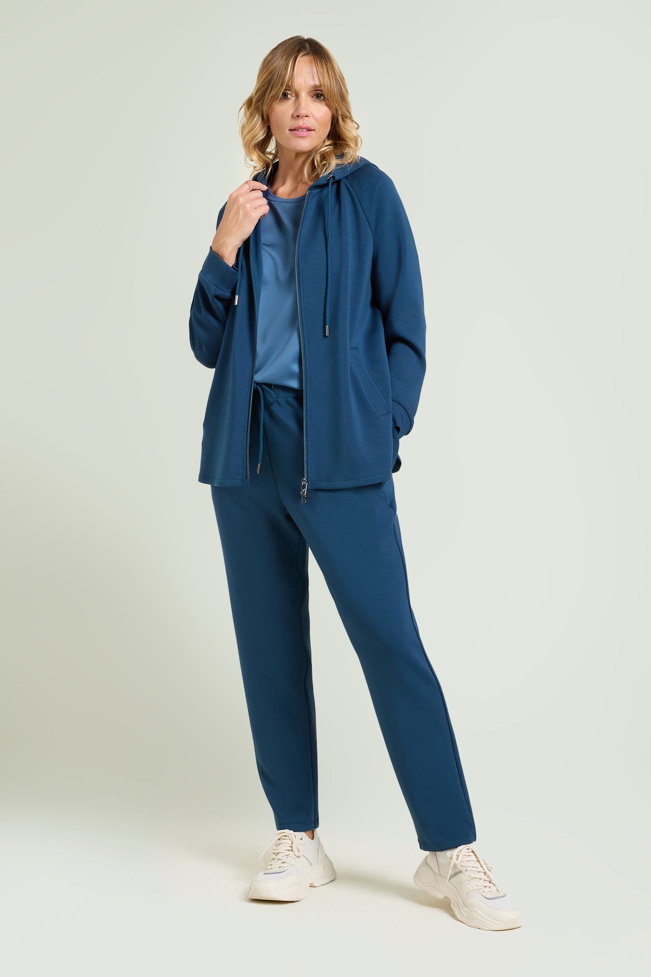 Felpa in jersey scuba soft touch realizzata in uno nuovo blu pavone. Tessuto stretch, taglio raglan, linea leggermente svasata con spacchi stondati, chiusura con zip a doppio cursore, cappuccio coulissato, tasche a filetto, dettagli gunmetal, tiretti con il logo "V" di Luisa Viola. Abbinabile a completo con pantaJogger nello stesso tessuto.