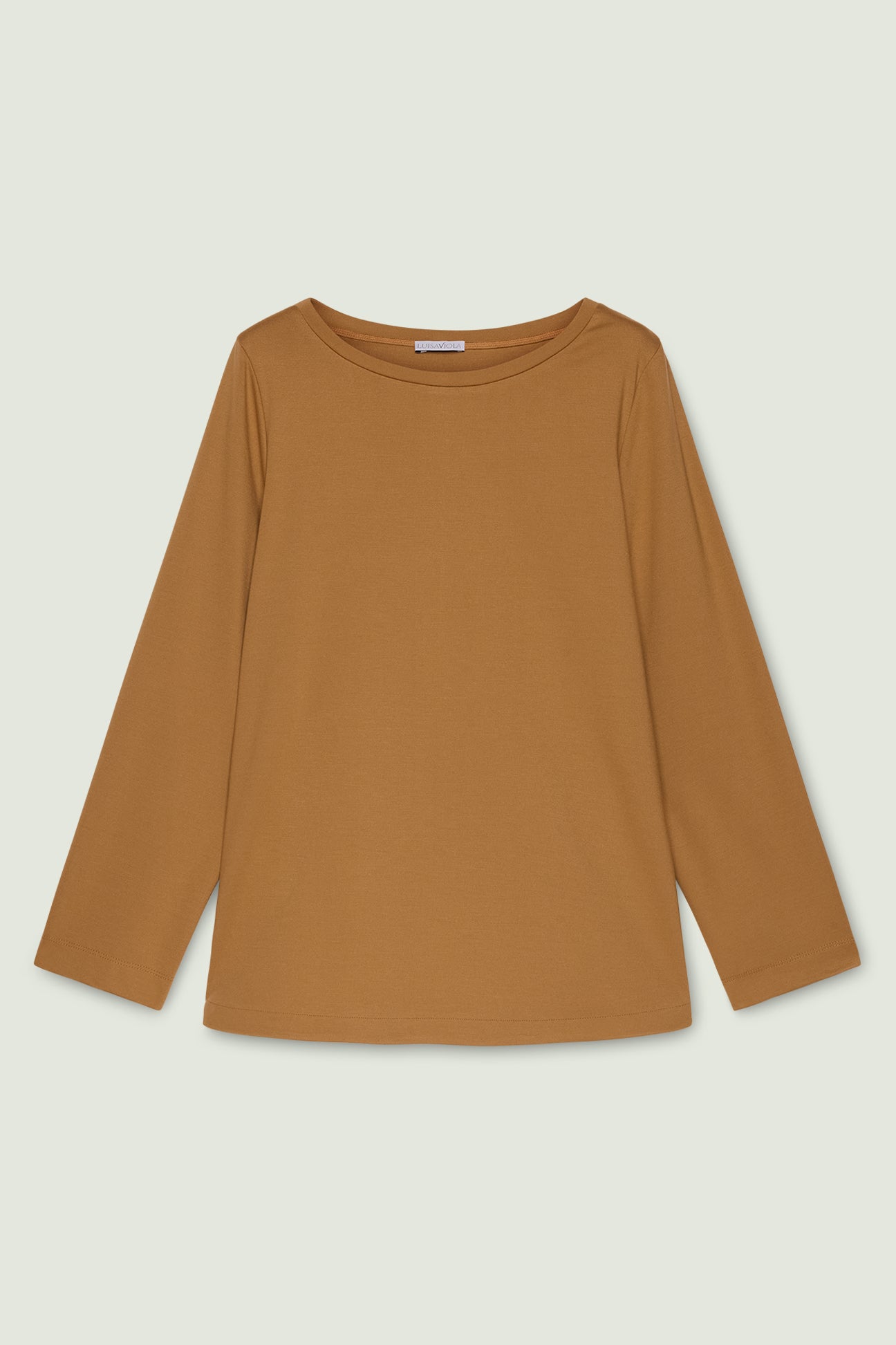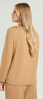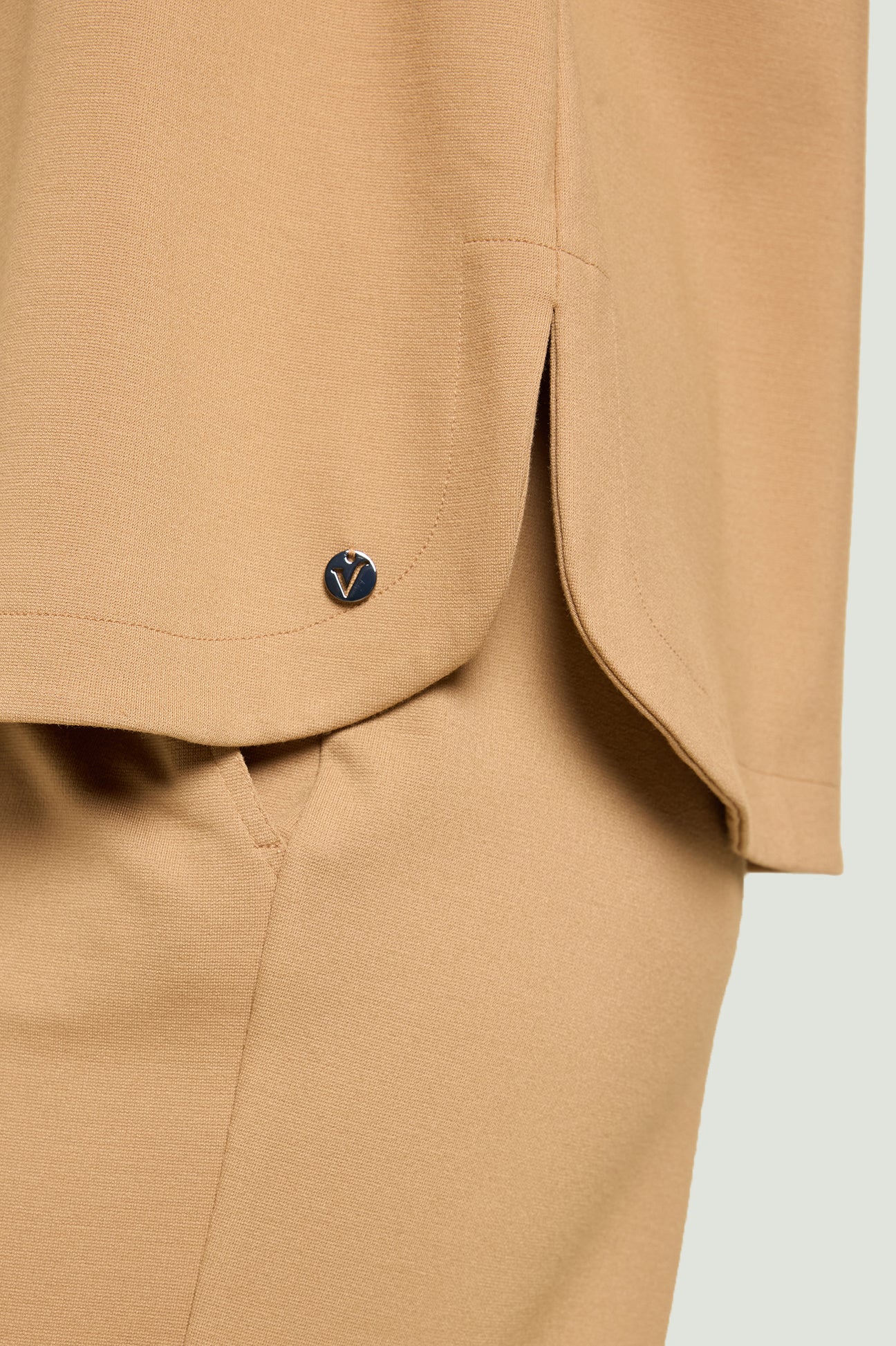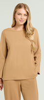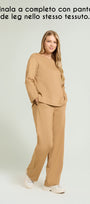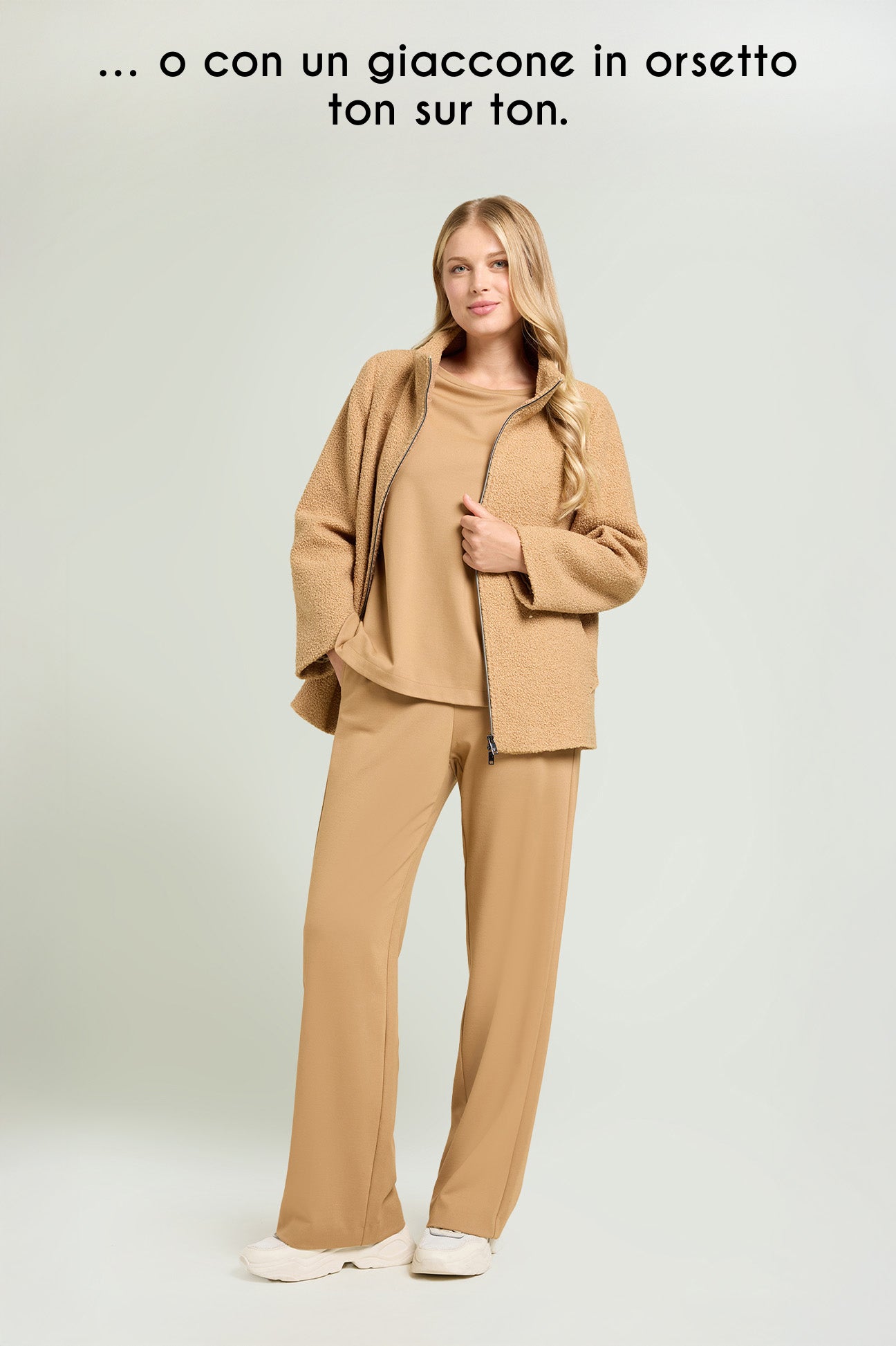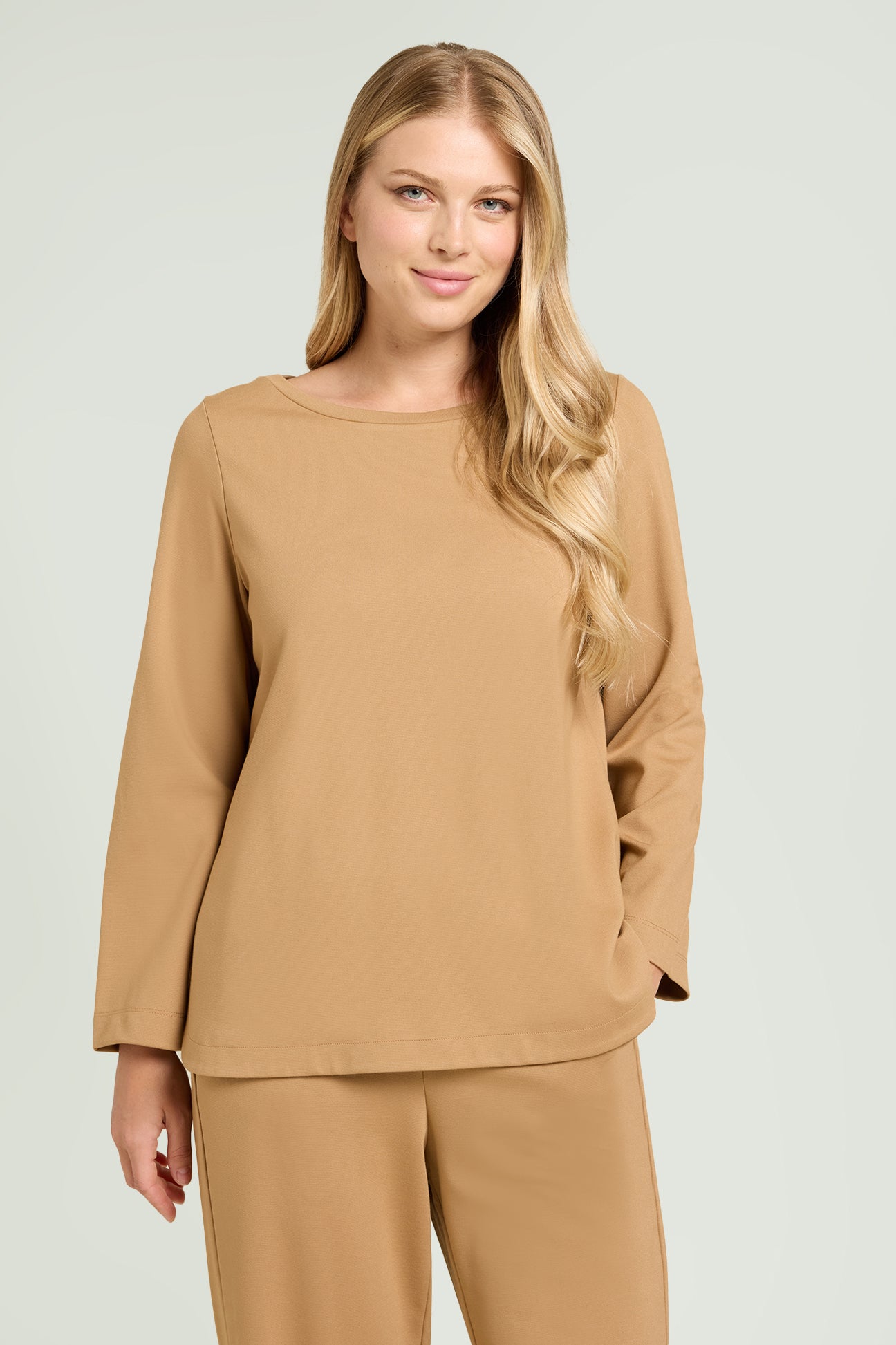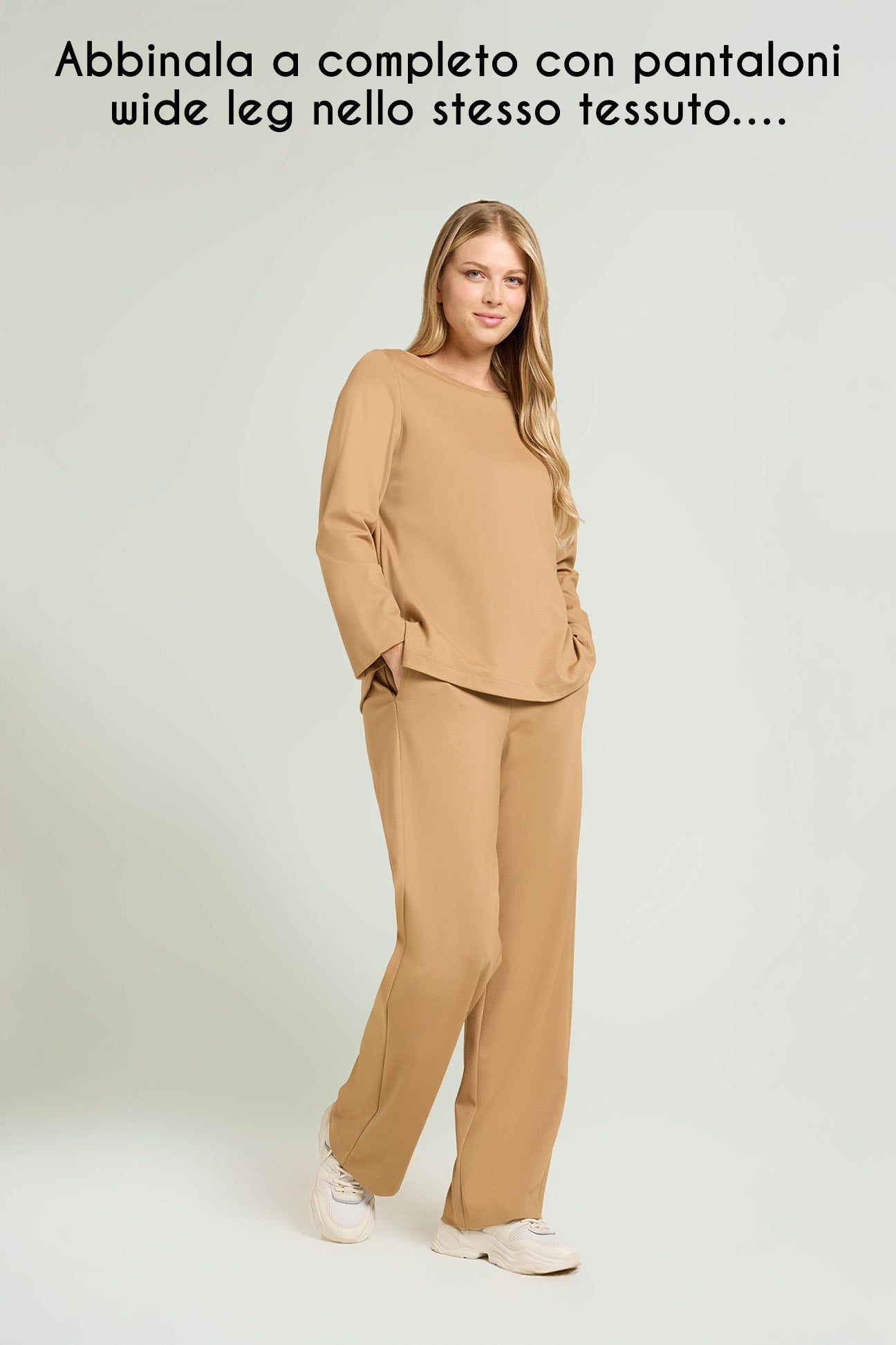 Felpa dalla linea dritta con scollo a barchetta e spacchi stondati realizzata in un morbido Punto Milano elasticizzato. Abbinabile anche a completo con pantaloni nello stesso tessuto.