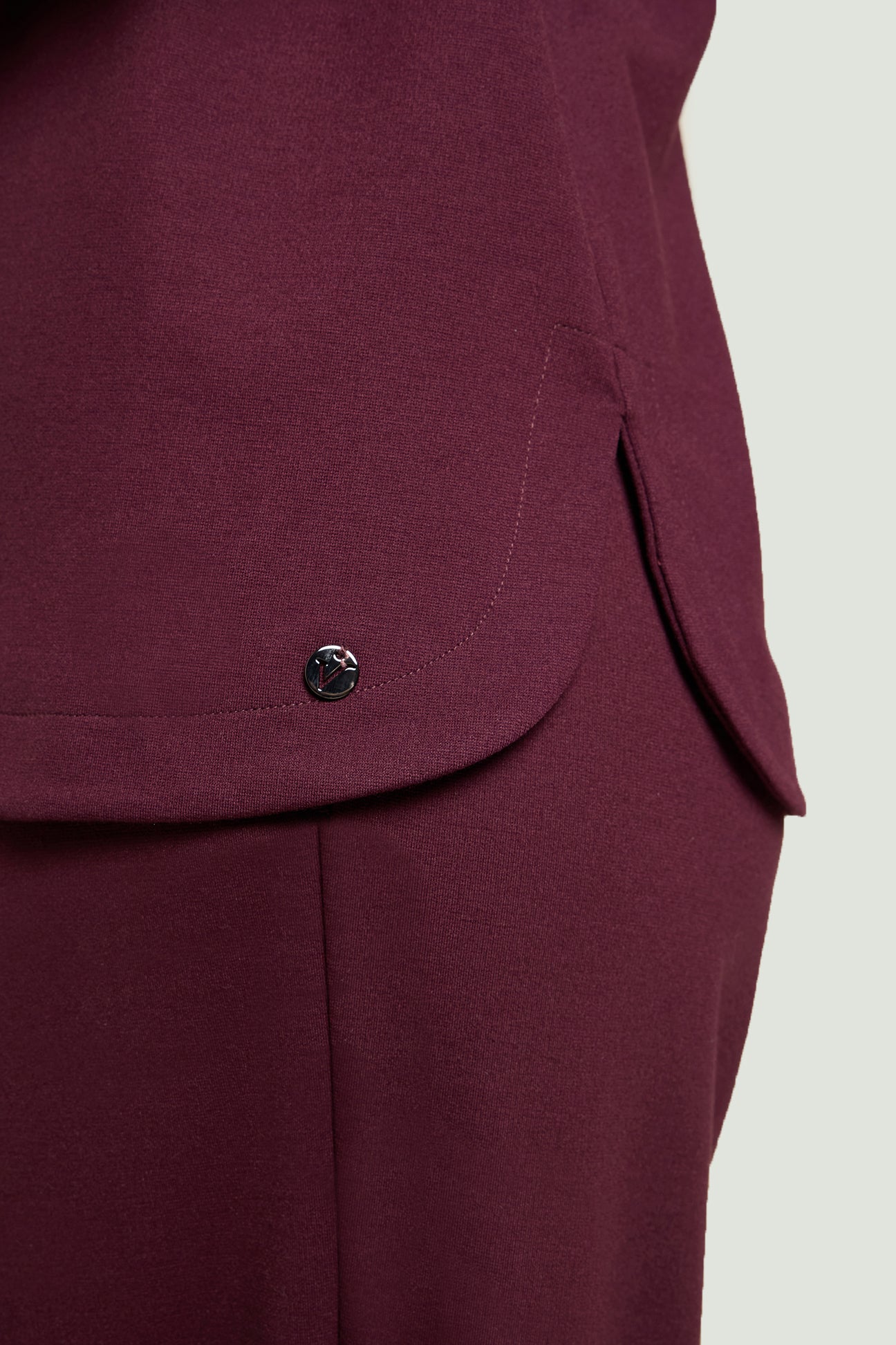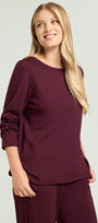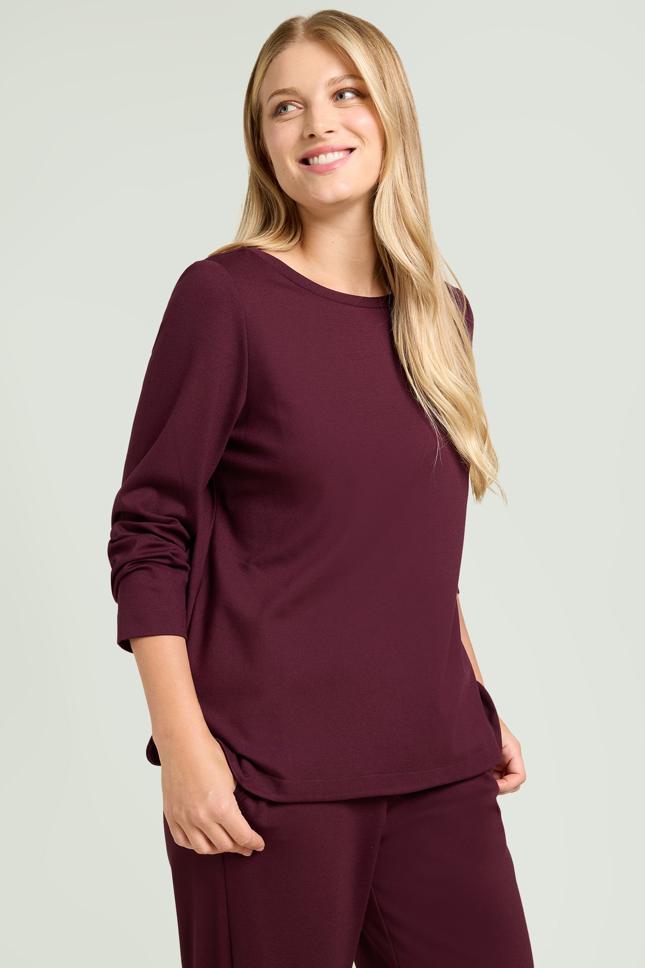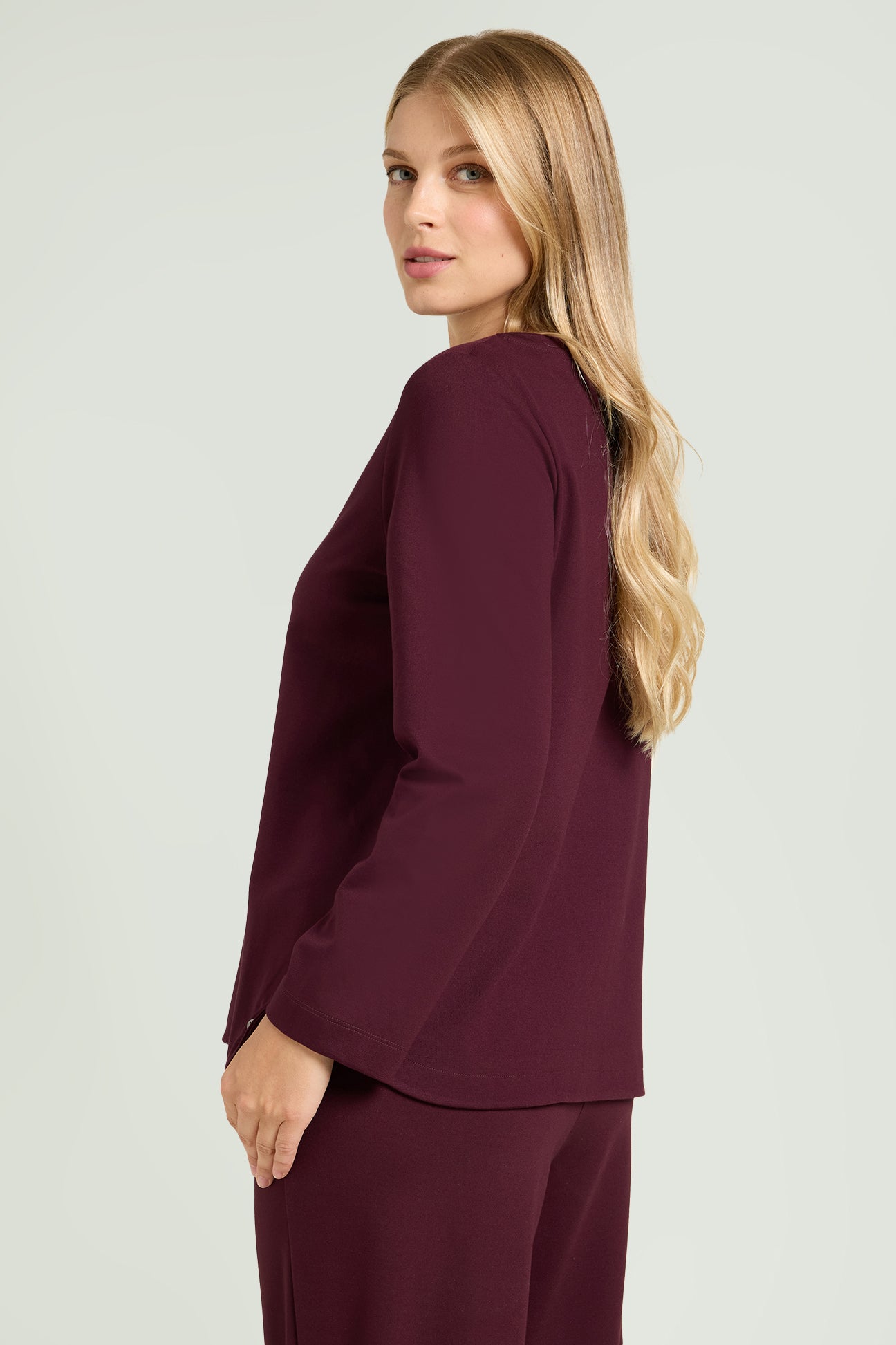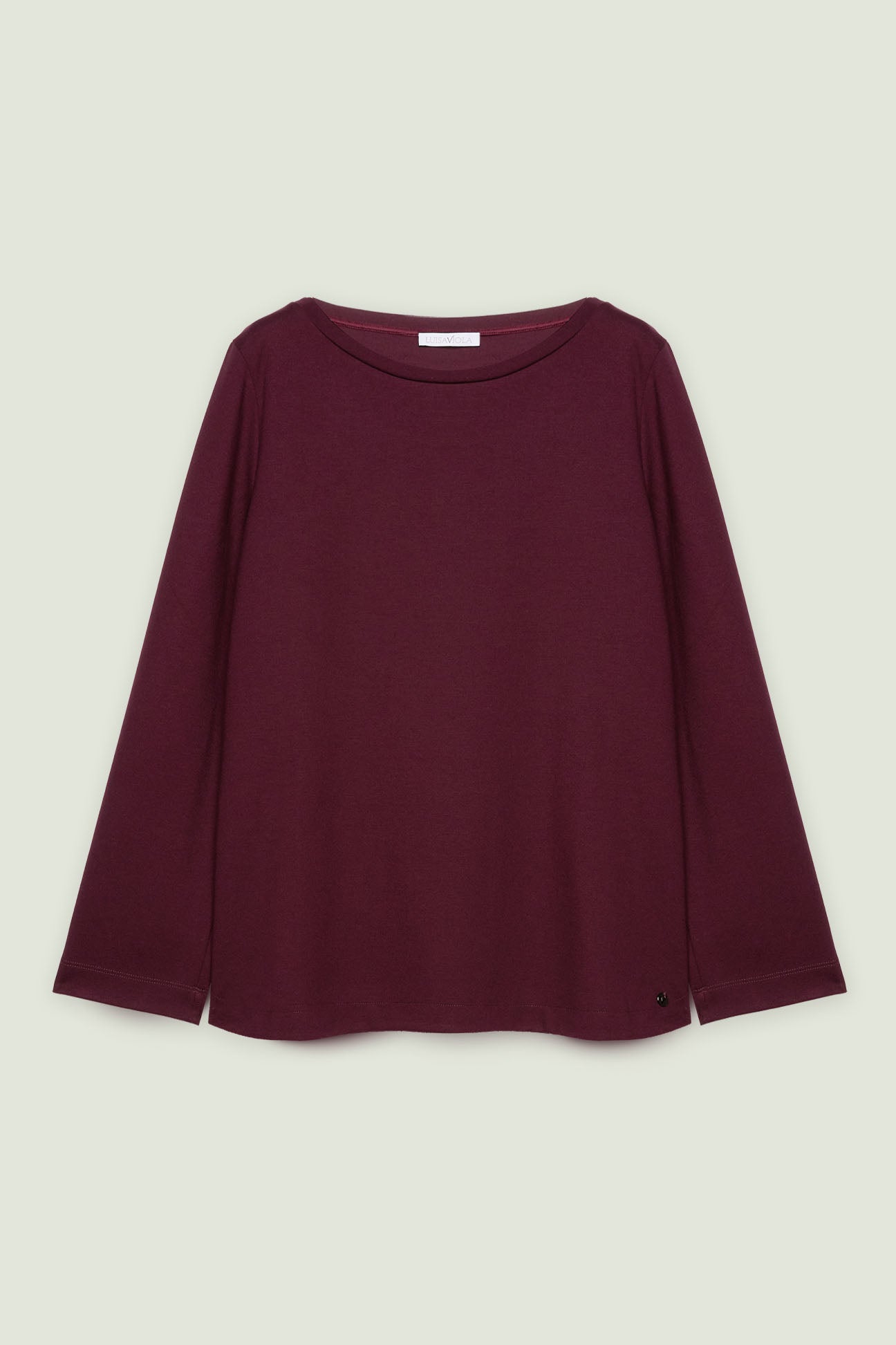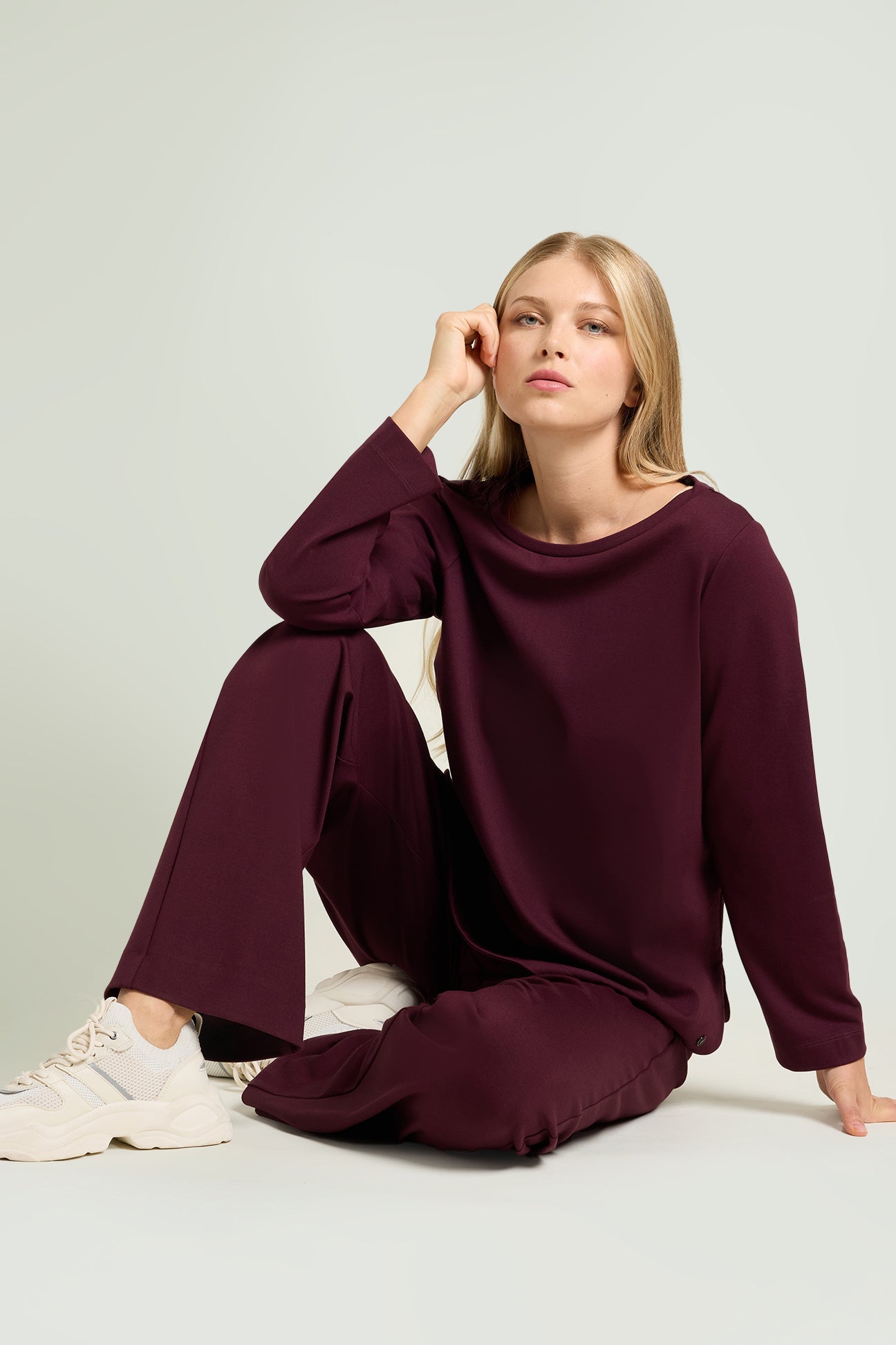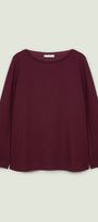 Felpa dalla linea dritta con scollo a barchetta e spacchi stondati realizzata in un morbido Punto Milano elasticizzato. Abbinabile anche a completo con pantaloni nello stesso tessuto.