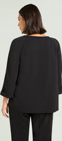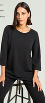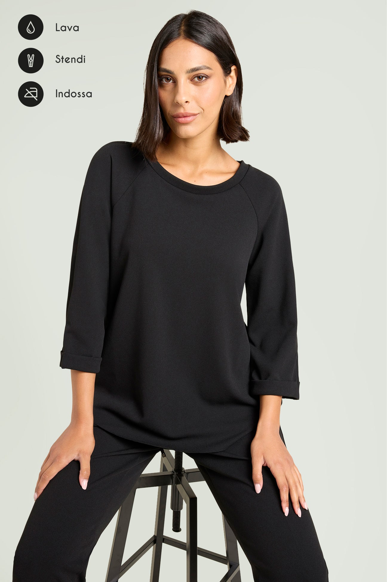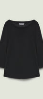 Felpa con taglio raglan in tessuto super-stretch: uno "scuba crepe" dalla caduta fluida caratterizzato da un rivescio raso che dona una piacevole sensazione sulla pelle. Linea boxy leggermente svasata, scollatura a barchetta, maniche con lunghezza a tre quarti e risvolto. Abbinabile anche a completo con pantaloni e gonne nello stesso tessuto.