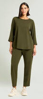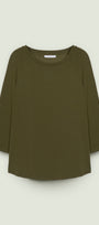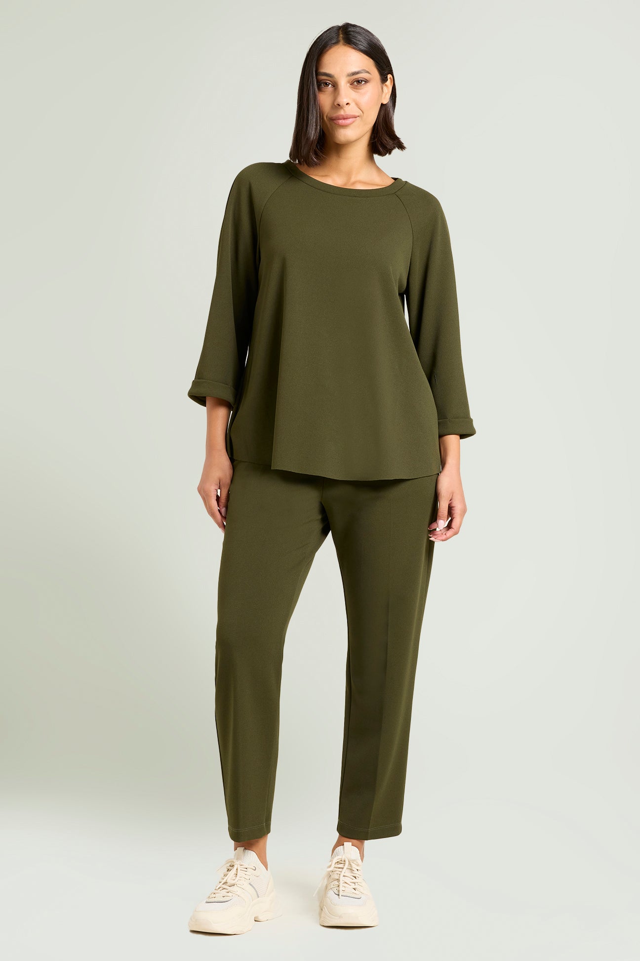 Felpa con taglio raglan in tessuto super-stretch: uno "scuba crepe" dalla caduta fluida caratterizzato da un rivescio raso che dona una piacevole sensazione sulla pelle. Linea boxy leggermente svasata, scollatura a barchetta, maniche con lunghezza a tre quarti e risvolto. Abbinabile anche a completo con pantaloni e gonne nello stesso tessuto.