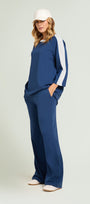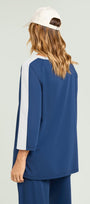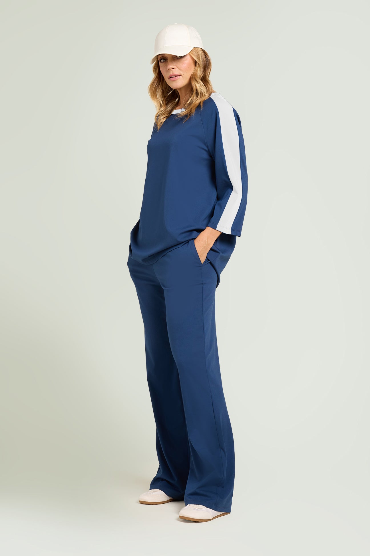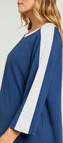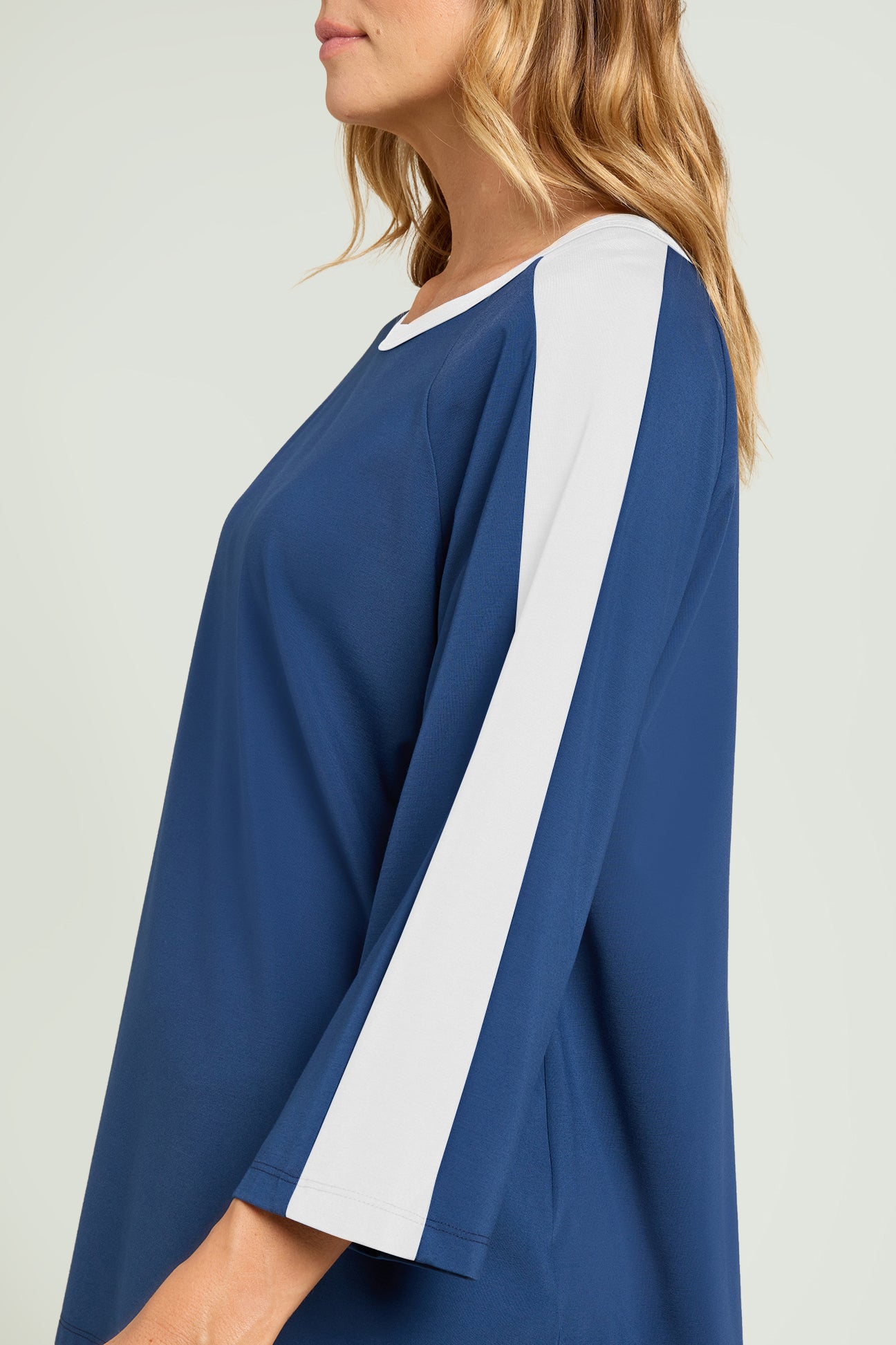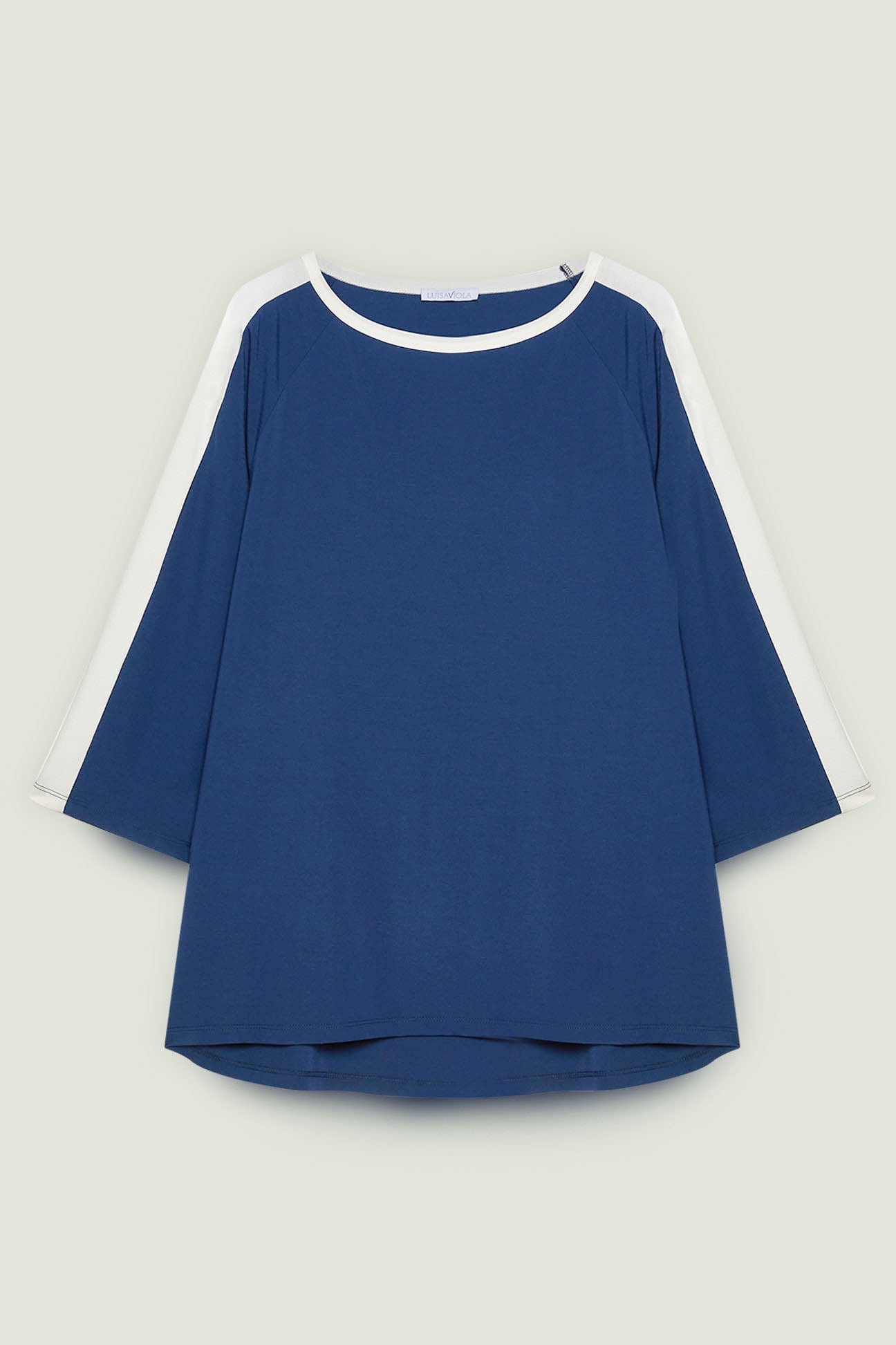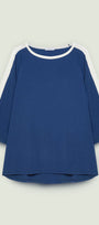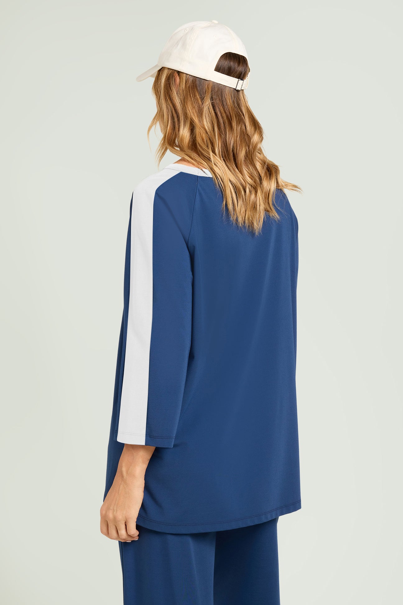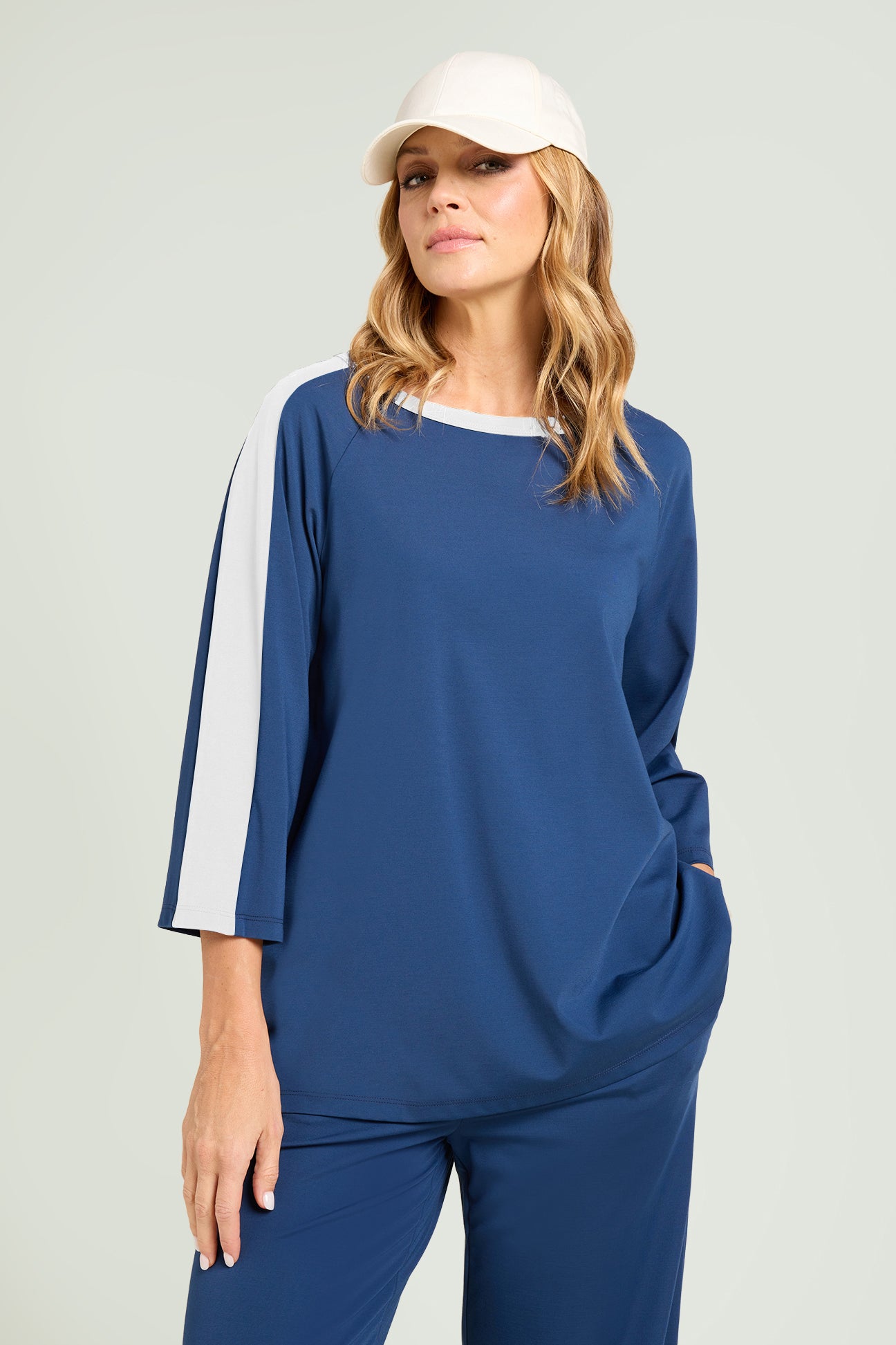 Felpa dalla linea leggermente svasata con taglio raglan. Scollo a barchetta, manica con lunghezza a tre quarti, dettagli a contrasto.