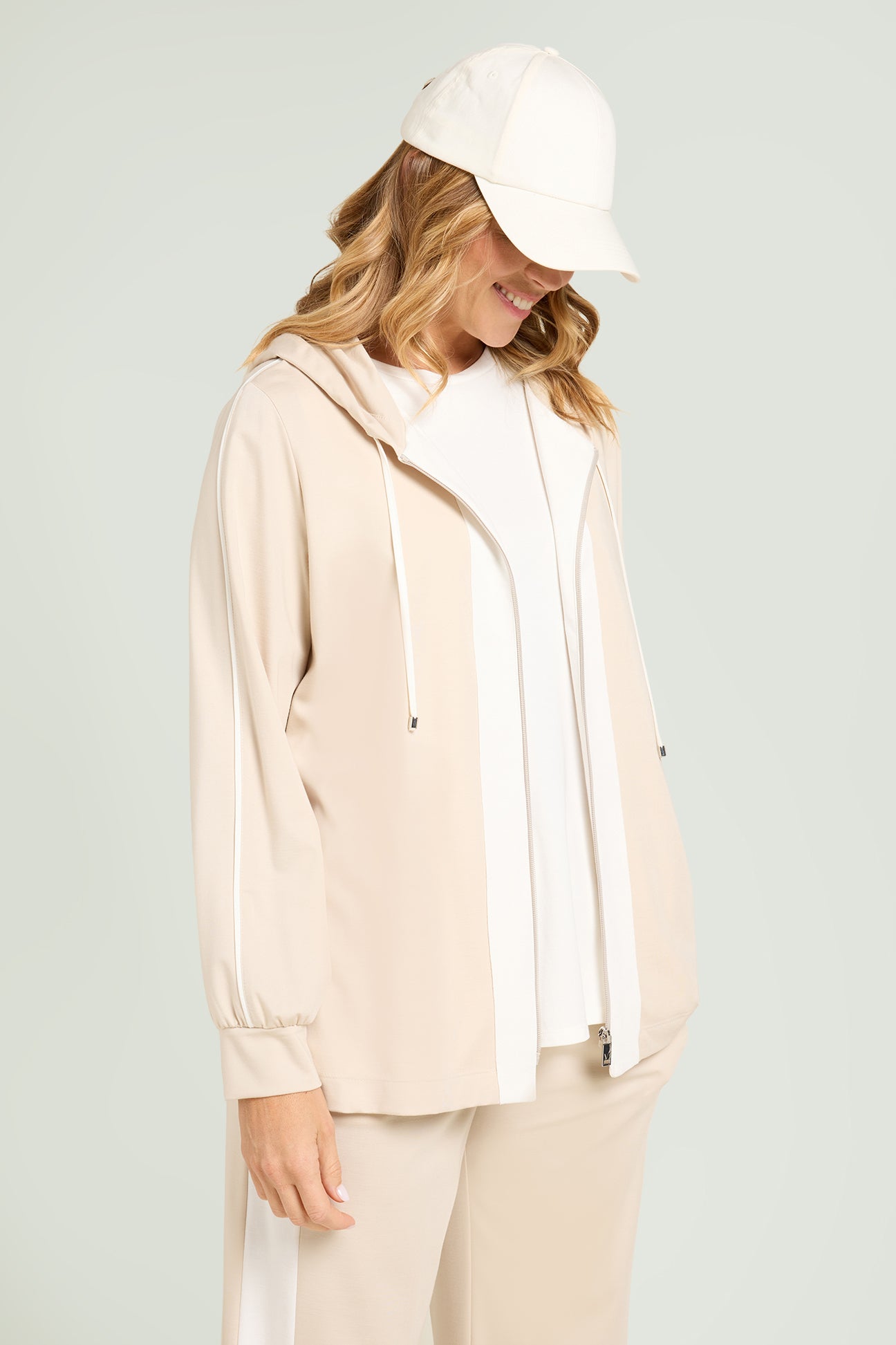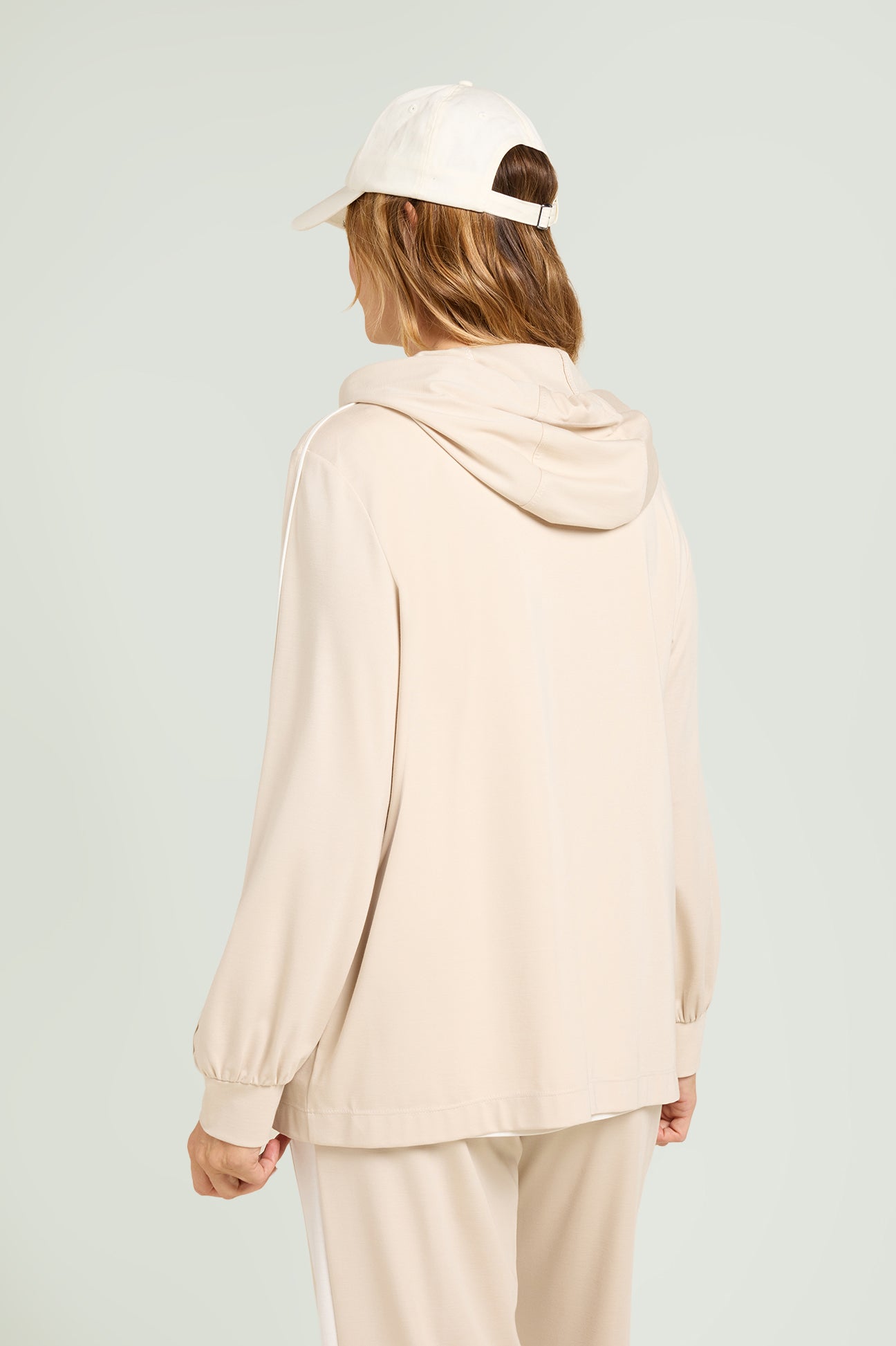 • Bi-Stretch • Traspirante • Comfort touch Felpa in tecnoviscosa dalla linea dritta. Cappuccio con coulisse, chiusura con zip, tiretto light gold con il logo "V" di Luisa Viola. Dettagli a contrasto.