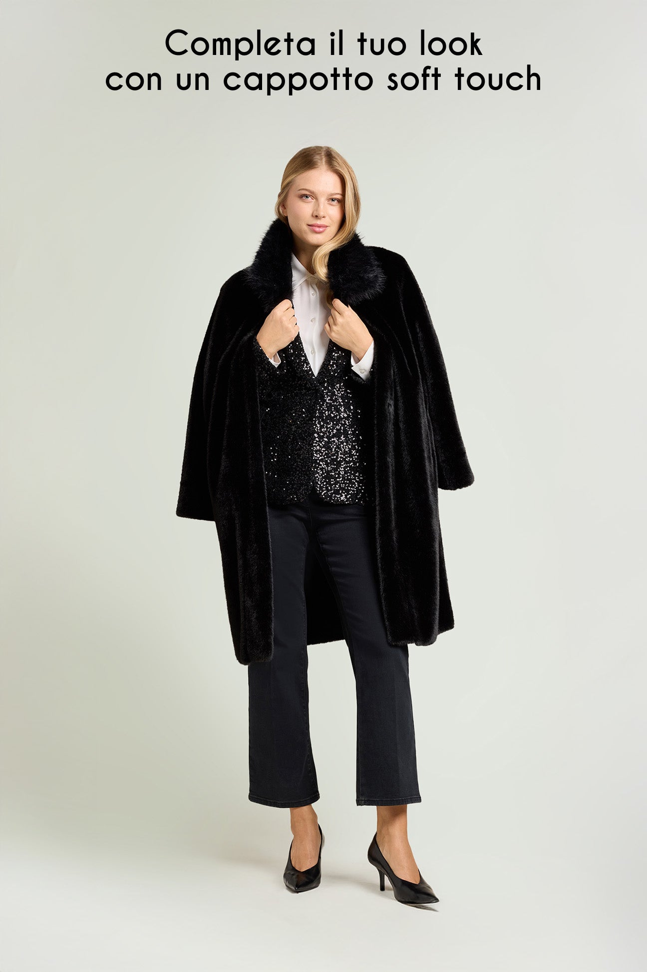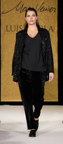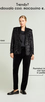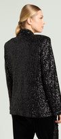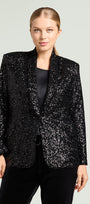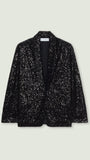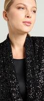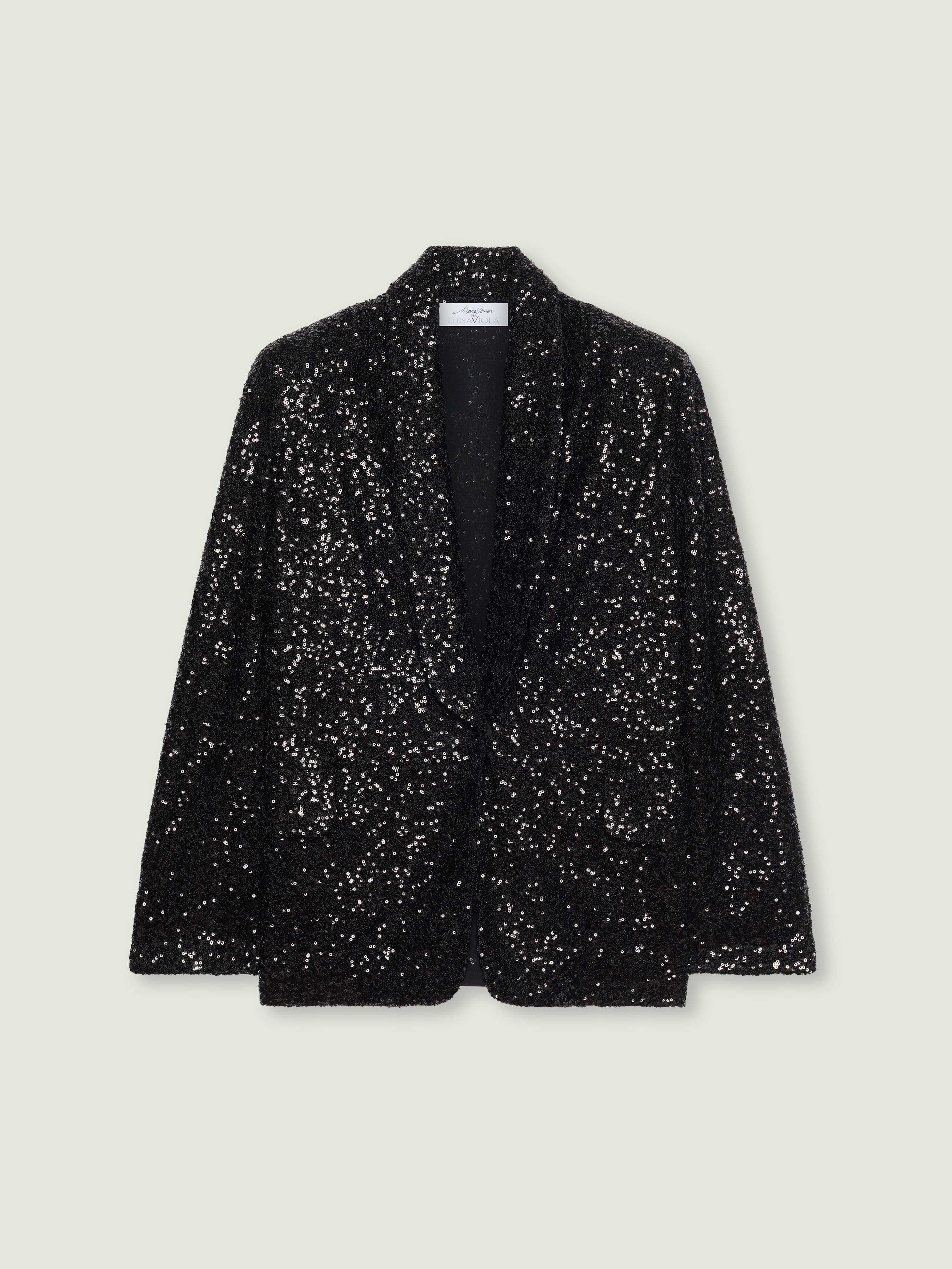 Giacca in tessuto full paillettes elasticizzato dalla linea scivolata, leggermente sciancrata. Collo sciallato, chiusura con bottone automatico nascosto, tasche a filetto, foderata in tulle stretch.
