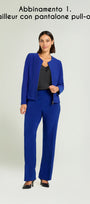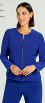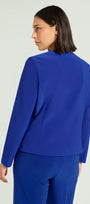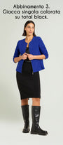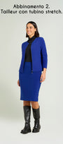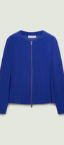 Collarless Jacket realizzata in compatto stretch. Linea leggermente sciancrata, paricollo, chiusura con zip doppio cursore. Tiretti in metallo con finitura gunmetal, personalizzati con il logo "V" di Luisa Viola. Abbinabile anche a completo con pantaloni e gonne nello stesso tessuto.