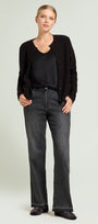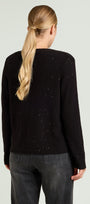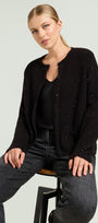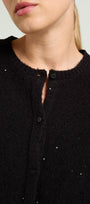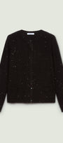 Cardigan-giacca soft touch dalla linea boxy in filato full-paillettes. Punto rovescio in finezza 7 con bordi in costa. Paricollo, chiusura con asole e bottoni, tasche applicate,