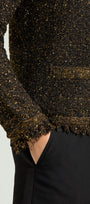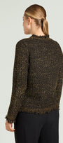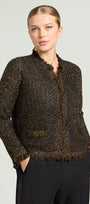 Giacca tricot realizzata in un filato mistolana bouclé con l'intervento di un filo lurex. Girocollo, chiusura con gancetti, bordi sfrangiati.