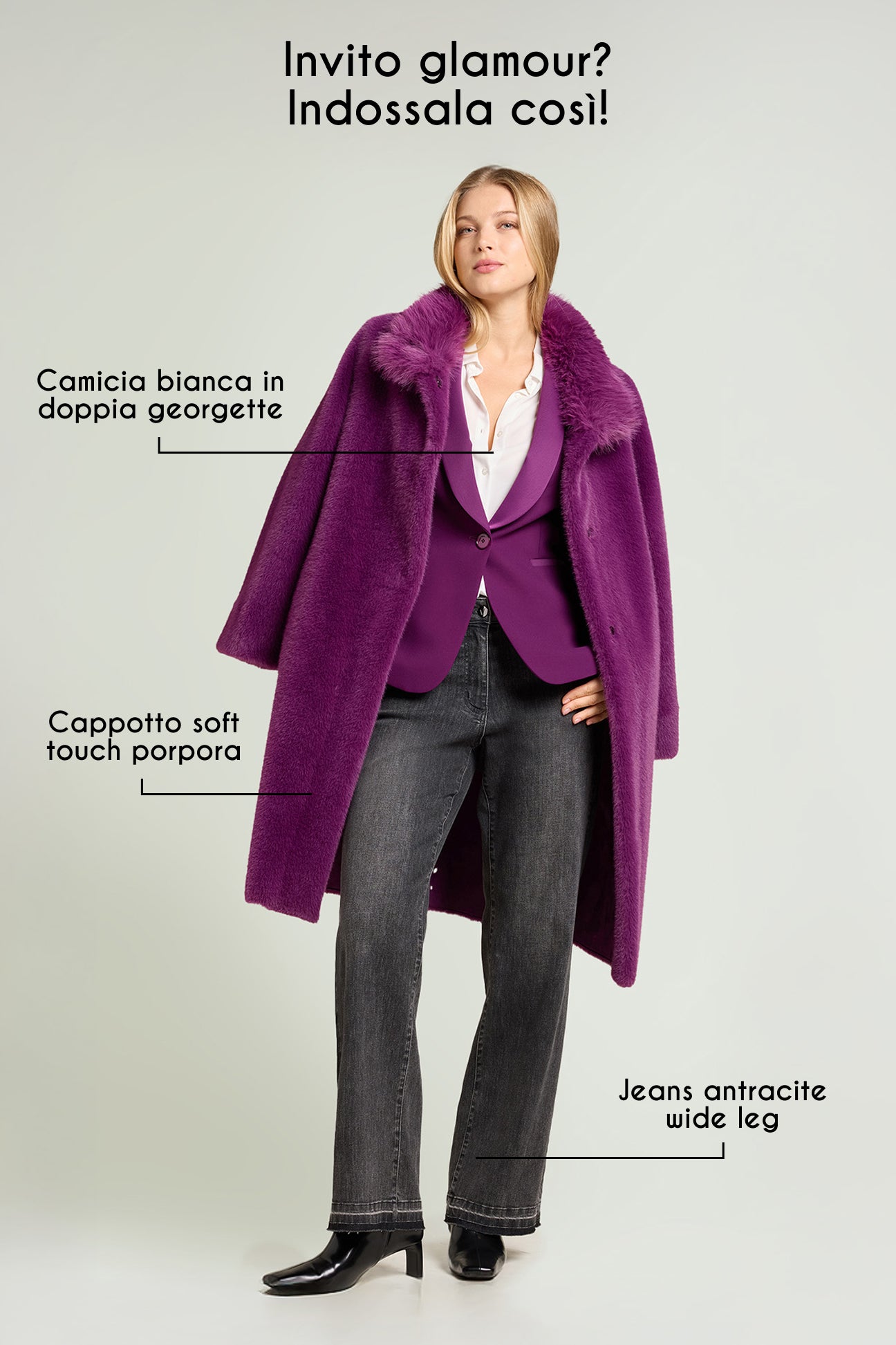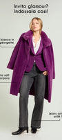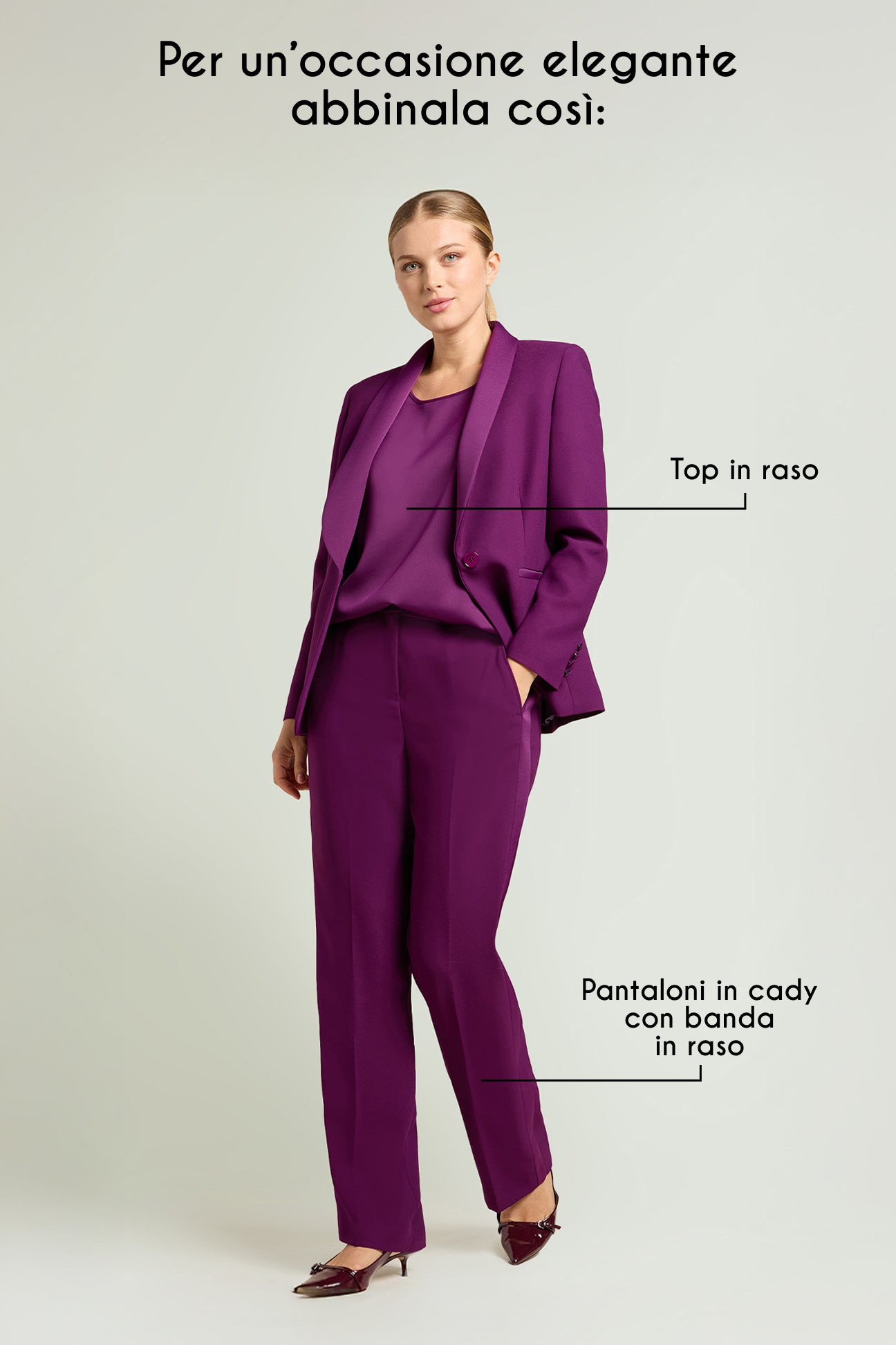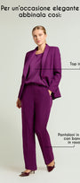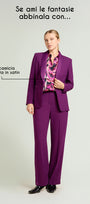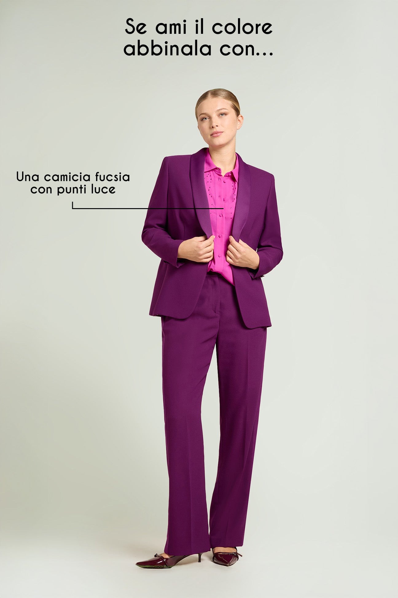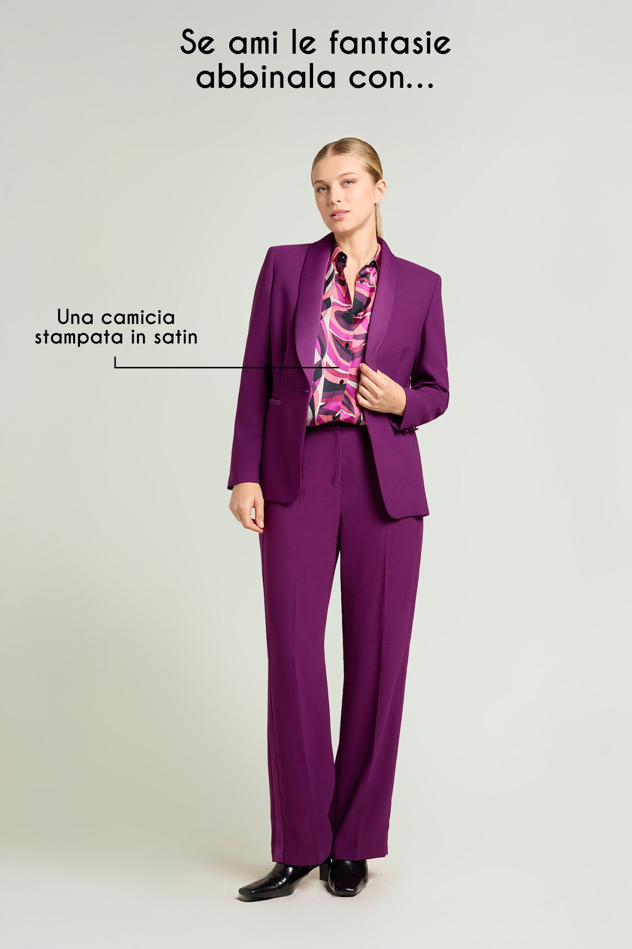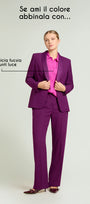 Disponibile in nero e nel nuovo color Porpora. Abbinabile anche a tailleur con pantaloni nello stesso tessuto.