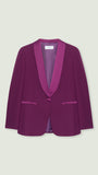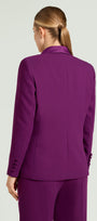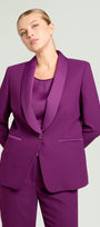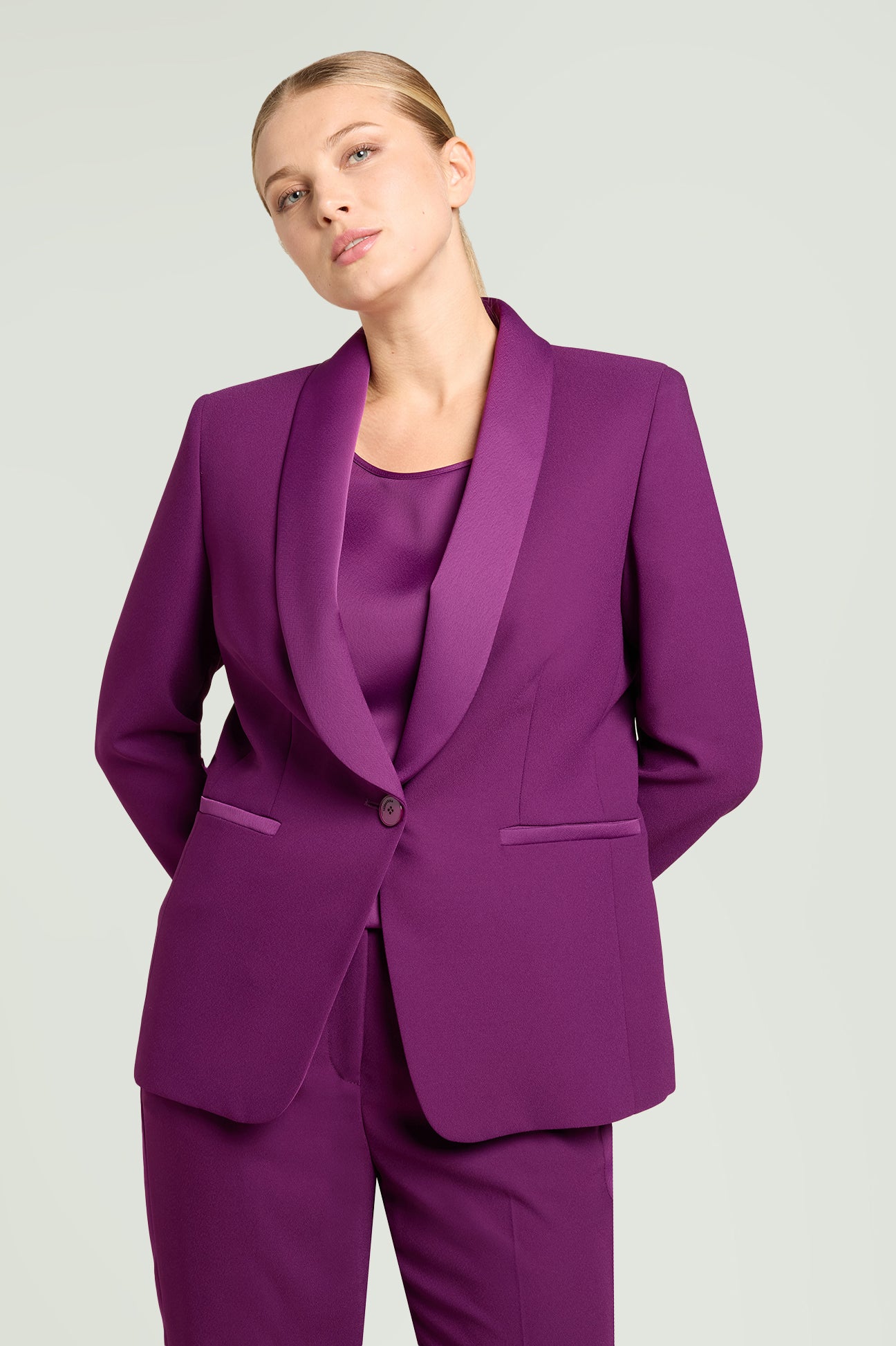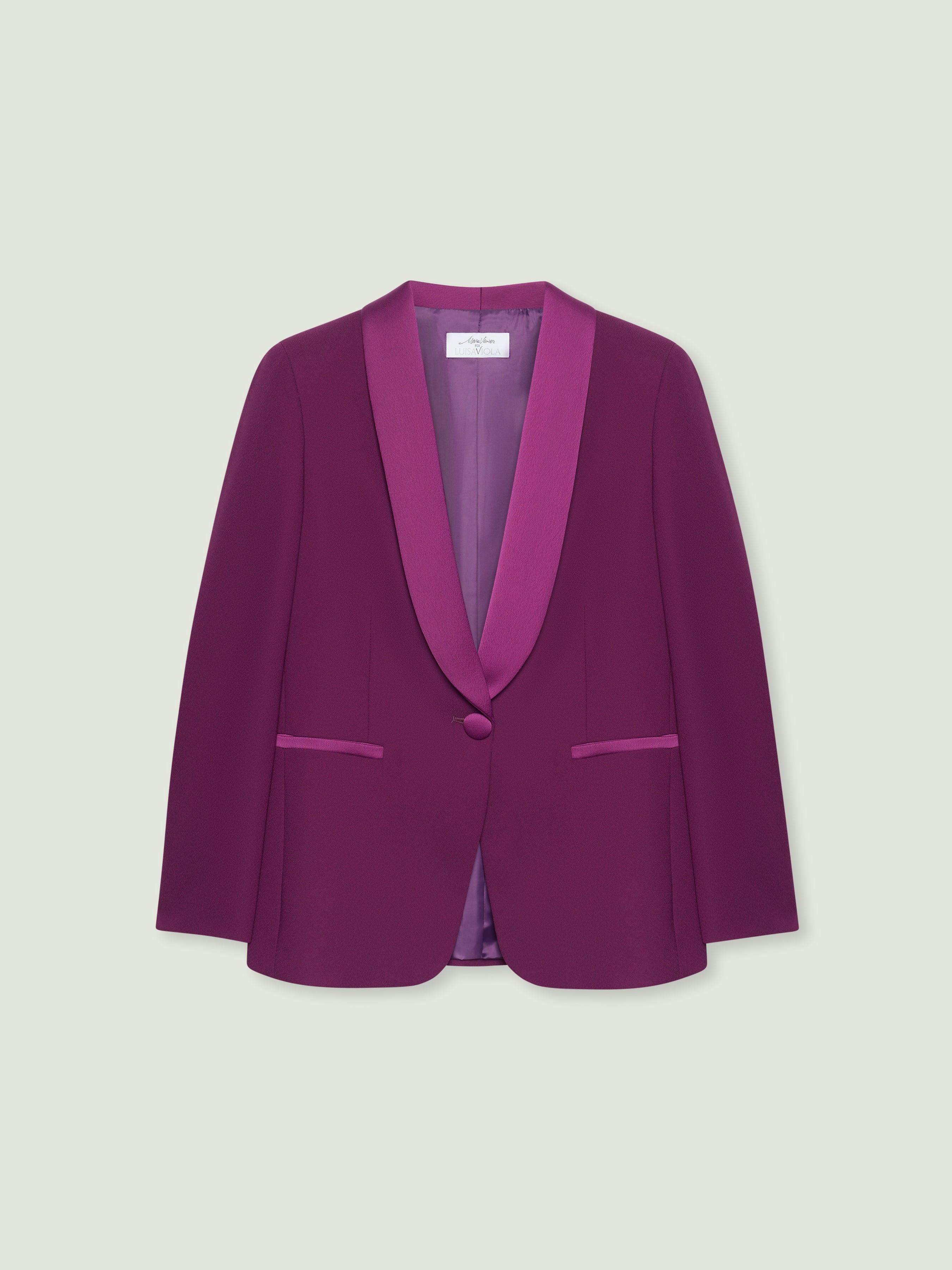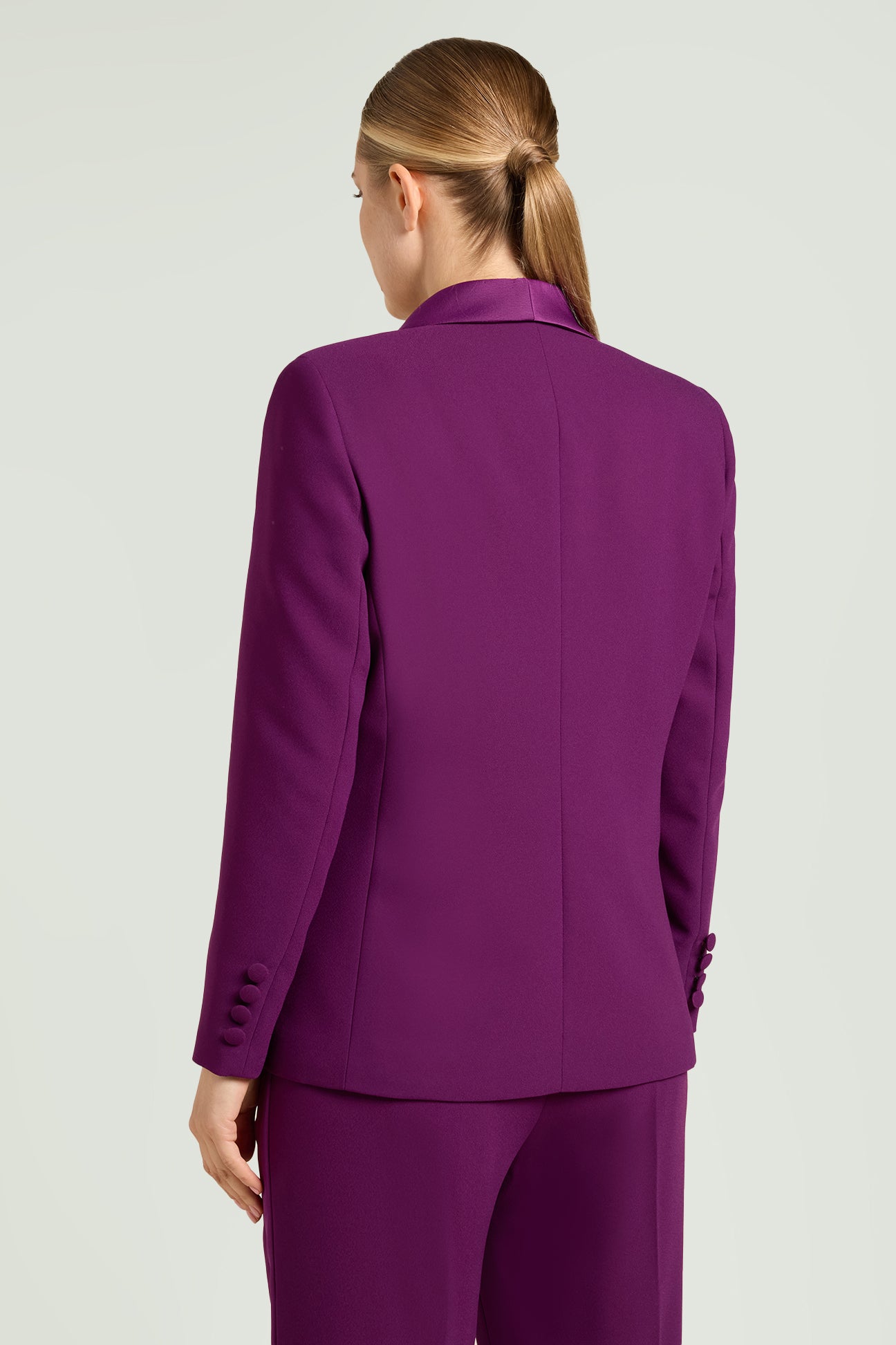 Giacca realizzata in tessuto crepe enver satin dalla linea leggermente sciancrata. Collo smoking in raso, chiusura con asola e bottone, fondo manica con quattro bottoni, tasche a filetto, bottoni in tessuto, foderata.