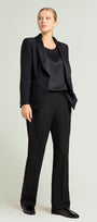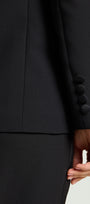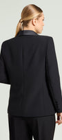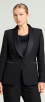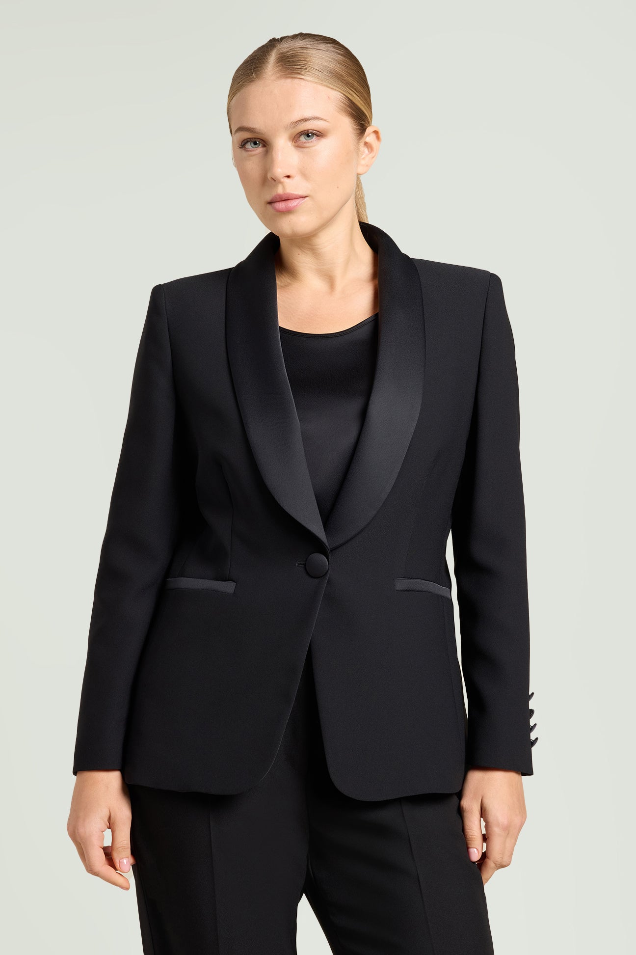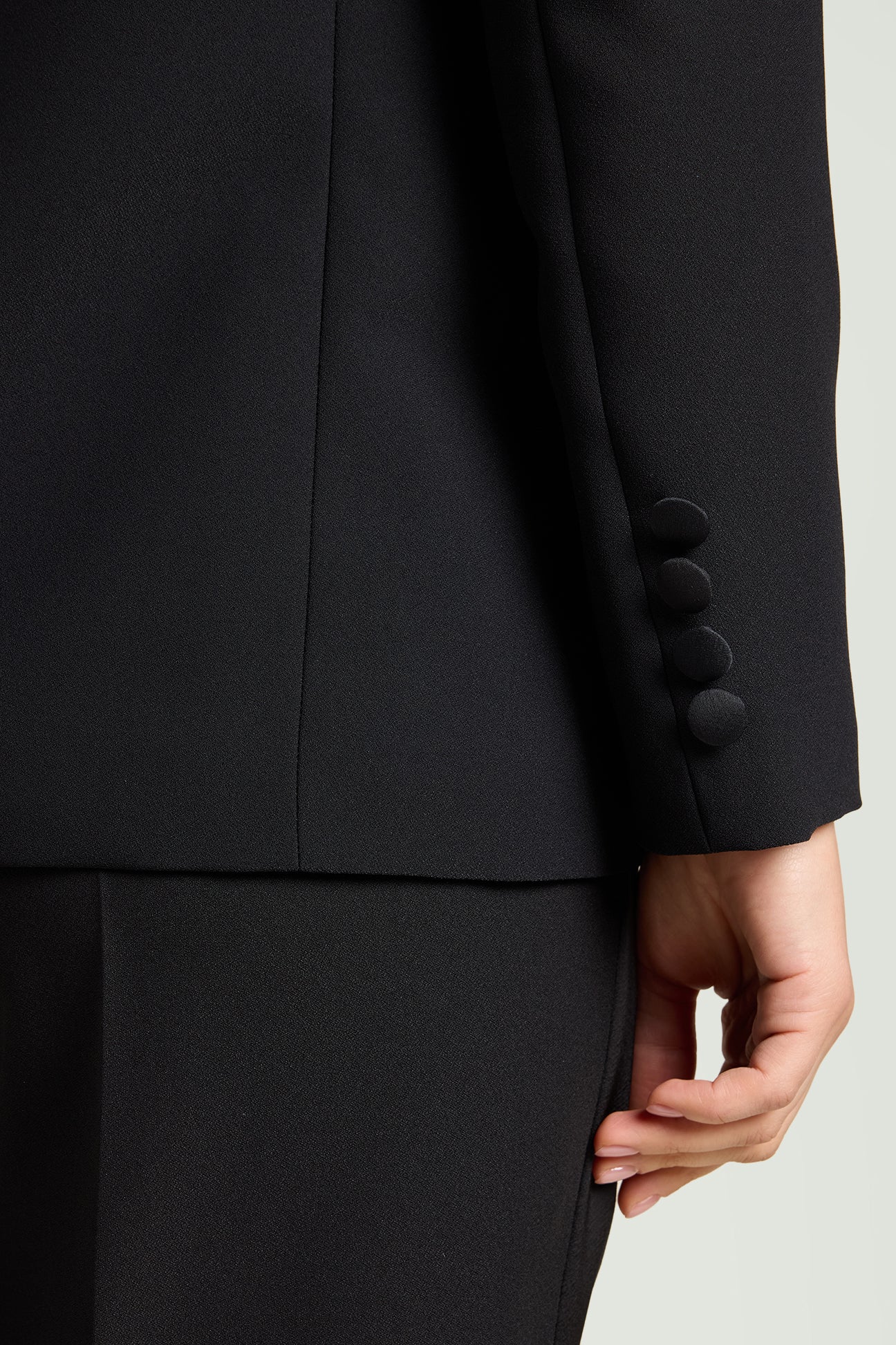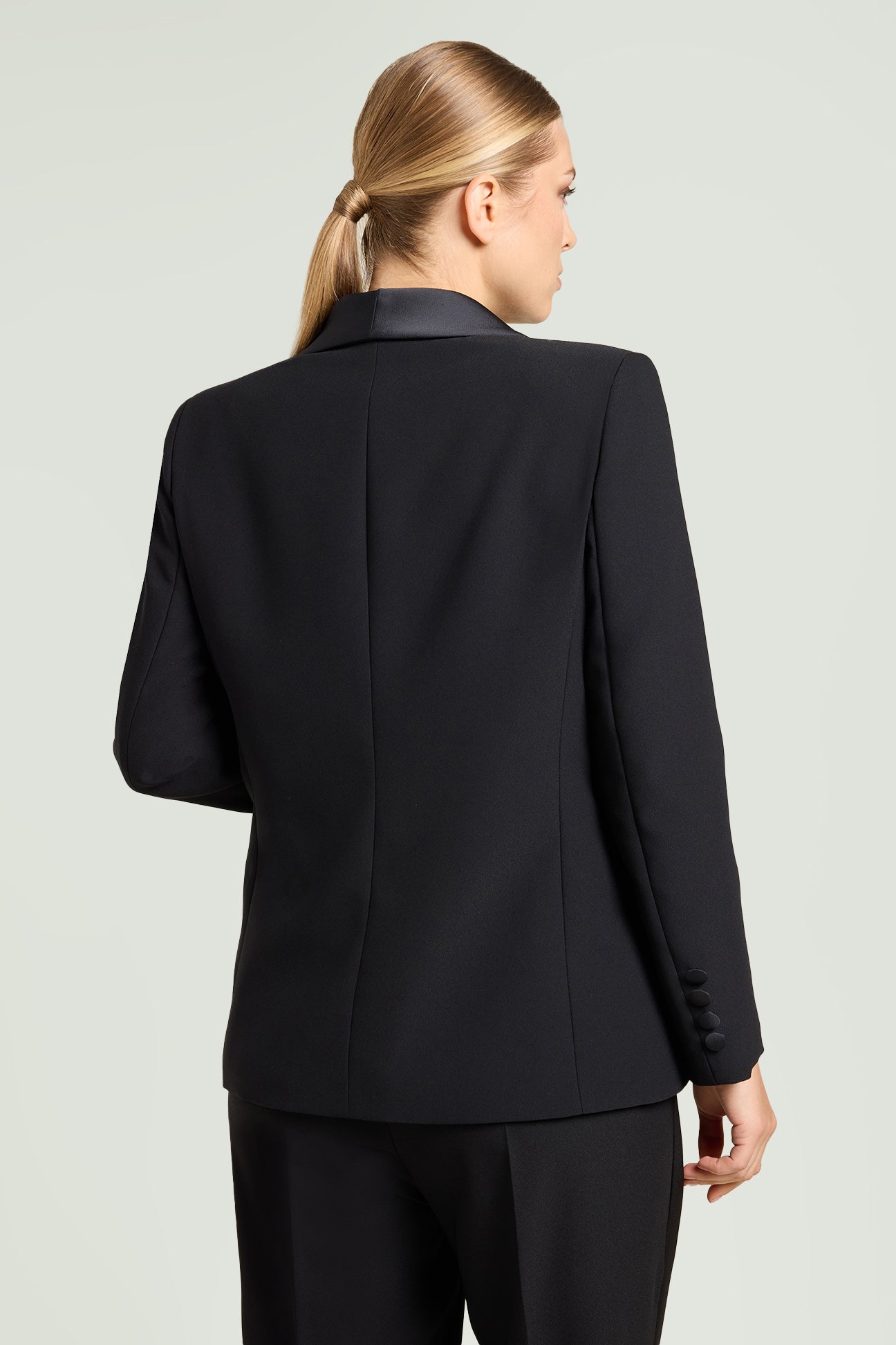 Giacca realizzata in tessuto crepe enver satin dalla linea leggermente sciancrata. Collo smoking in raso, chiusura con asola e bottone, fondo manica con quattro bottoni, tasche a filetto, bottoni in tessuto, foderata.