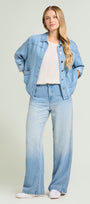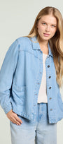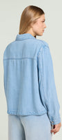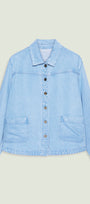 Giacca/camicia in denim (8,5 once) dalla linea fluida. Colletto, chiusura con asole e bottoni, tasche applicate, manica lunga con polso, sfoderata. Trattamento stone bleached. Dettagli nikel free con il logo "V" di Luisa Viola. Facilmente abbinabile, si può anche indossare in coordinato con capi realizzati nello stesso tessuto.