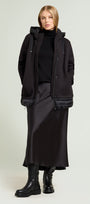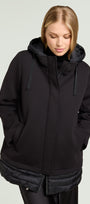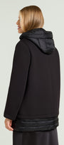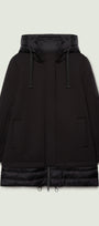 Capospalla in scuba con interno e dettagli in nylon trapuntato. Linea leggermente svasata, collo a listino, cappuccio staccabile con coulisse e nastro gros grain. Doppia chiusura nascosta con bottoni automatici e zip con doppio cursore. Tasche inclinate, fondo in nylon con coulisse regolabile. Imbottitura in ovatta.